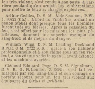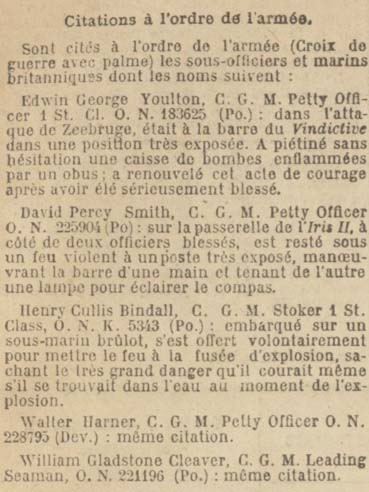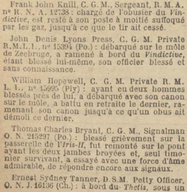 — L’ordre fut alors donné de sonner la retraite. Les deux sirènes du Vindictive, ainsi que ses deux projecteurs de bâbord et tribord ayant été détruits, le signal de repli fut péniblement donné par la sirène du Daffodil. A ce moment, un obus vint mettre le feu à des caisses de bombes munies de leurs fusées, mais l’incendie fut circonscrit au péril de sa vie par un valeureux quartier-maître de timonerie, Edwin George YOULTON, qui, par deux fois, piétina sans hésitation les caisses enflammées, tous les extincteurs disponibles ayant été détruits.