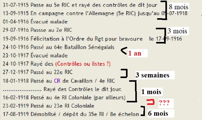 Il semble qu'il la passe presque entièrement au 4e RIC; sauf du 11 Avril 1918 au 5 Juillet 1918 où il n'est pas "en campagne contre l'Allemagne", et doit donc se trouver "à l'ombre"...