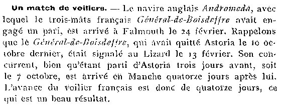 Lors du pari signalé par Rutilius entre le Général de Boisdeffre et le quatre-mâts Britannique Andromeda, capitaine R.J. Deeks, le voilier français était commandé par le capitaine au long cours Ernest Ybert, dont c'était le premier commandement. Il commandera ensuite le trois-mâts René Kerviler de 1911 à 1914, puis le quatre-mâts Ville du Havre qu'il perdra, coulé par l'U 32 le 7 mars 1916 (sujet dans le forum), et ce sera la même chose avec le quatre-mâts Asnières, coulé le 2 janvier 1917 par la Möwe. Le capitaine Ernest Ybert servira ensuite dans la Marine nationale pour la durée de la guerre.