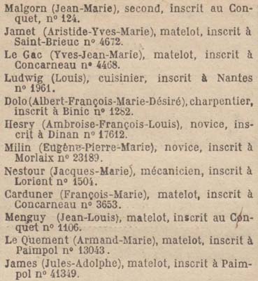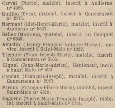 Source : René Richard et Jacques Roignant, Les navires de la Bretagne provinciale coulés par faits de guerre 1914-1918, Volume 2, Association Bretagne 14-18, 2010, page 257.