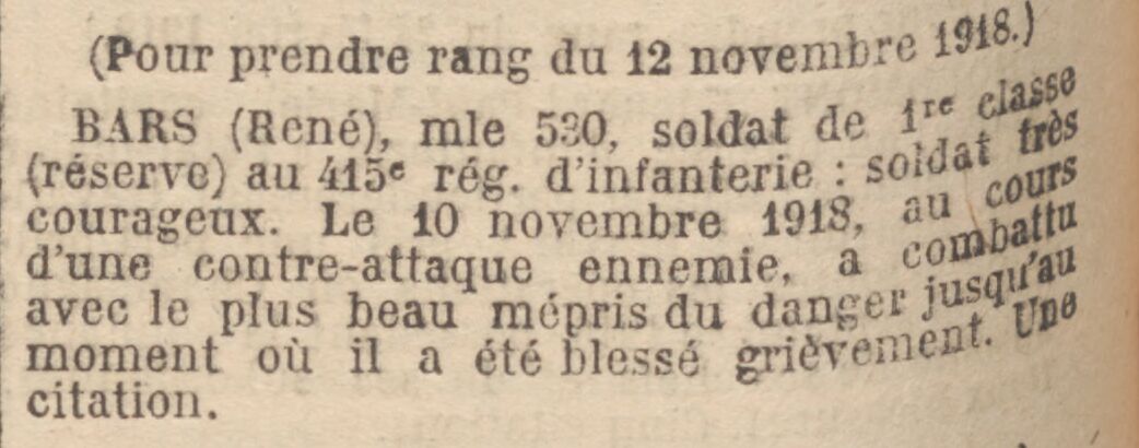 BARS (René), matricule 530, soldat de 1ère classe (réserve) au 415e régiment d'infanterie : soldat très courageux. Le 10 novembre 1918, aa cours d'une contre-attaque ennemie, a combattu avec le plus beau mépris du danger jusqu'au moment où il a été blessé grièvement. Une citation.