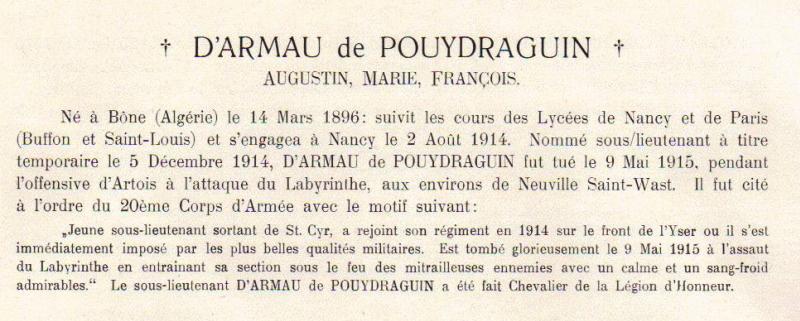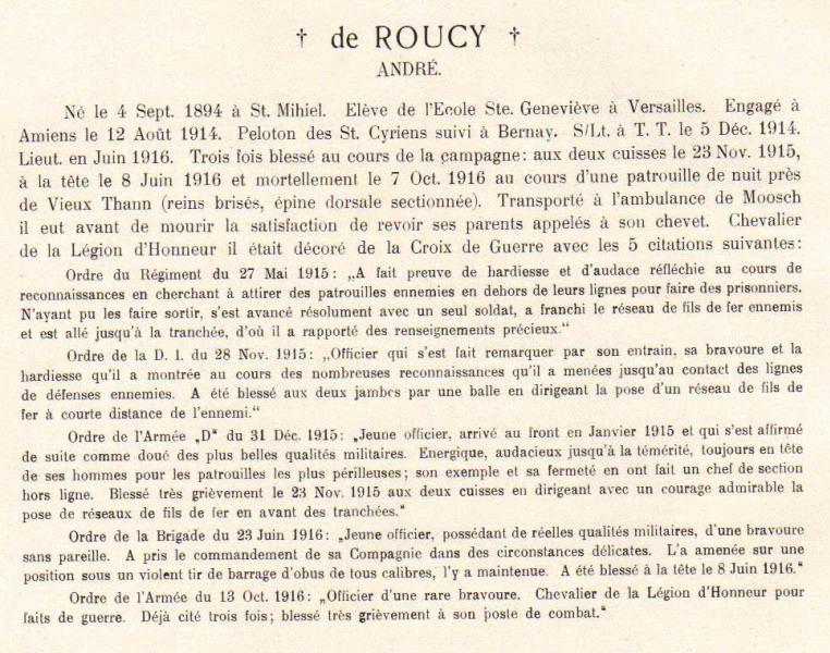 bonsoir, j'ai en ma possession le livre d'or de la promotion de "LA GRANDE REVANCHE" st cyr 1914 (tiré a 400 ex) contenant les 797 jeunes gens déclarés admissibles a l'ecole speciale militaire de st cyr.Partis 797 au front ils ne sont revenus que 344;453 on fait a la patrie l'offrande de leur jeunesse et de leur espoirs.Ce livre comprent plus de 400 biographies et 369 photos, les biographies comporte le parcour, les medailles et les citations.Si se livre peut vous aider pour des recherches n'esiter pas. le cadetmesimages/6742/14 18.jpg