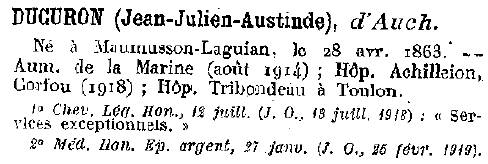 Chevalier de la Légion d’honneur au titre du Ministère de la Marine (Arr. du 12 juill. 1918, J.O. du 13 juill. 1913). Alors domicilié à Auch (Gers), rue Victor Hugo.