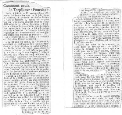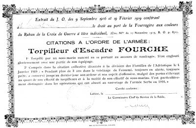 □ Bâtiment cité à l’ordre de l’armée dans les termes suivants (J.O. 9 sept. 1916, p. 8.039) : « Le torpil-leur d’escadre Fourche : torpillé par un sous-marin ennemi en se portant au secours de naufragés. S’est englouti glorieusement avec une partie de son équipage. »