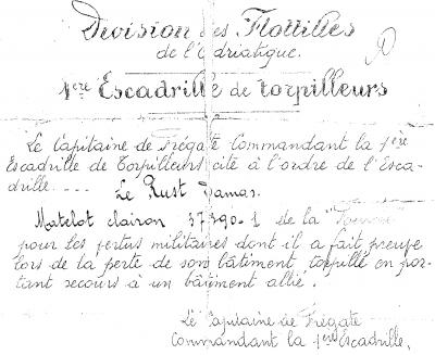 □ Puis compris dans la citation collective à l’ordre de l’armée décernée le 4 janvier 1919 à la Division des Flottilles de l’Adriatique (J.O. 19 févr. 1919, p. 1.857) : « La Division des flottilles de l’Adriatique : pendant plus de trois ans, dans le voisinage de l’ennemi, toujours en alerte, toujours prête, a conservé jusqu’au dernier jour son ardeur et son esprit d’offensive malgré des pertes s’élevant au quart de son effectif de torpilleurs et à la moitié de son effectif de sous-marins. S’est particulièrement distinguée dans les opérations qui ont abouti au sauve-tage de l’armée serbe en 1916. »