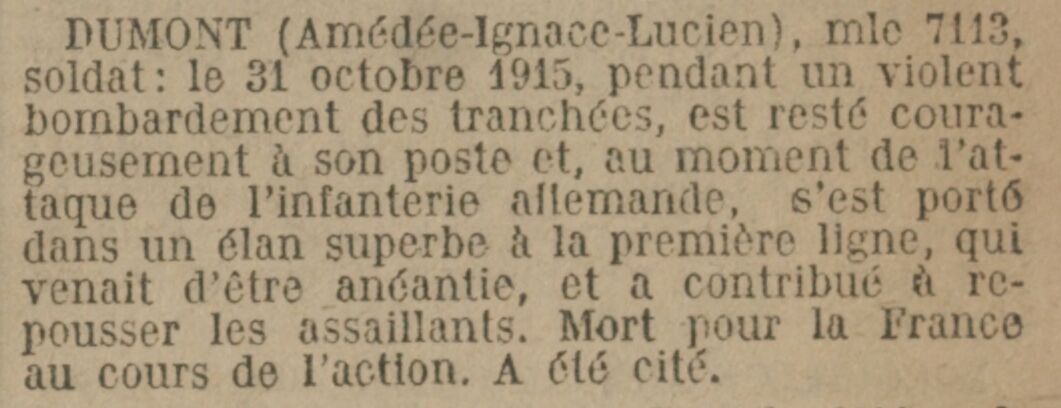 DUMONT (Amédée-Ignace-Lucien), matricule 7113, soldat : le 31 octobre 1915, pendant un violent bombardement des tranchées, est resté courageusement a son poste et, au moment de l'attaque de l'infanterie allemande, s'est porté dans un élan superbe, à la première ligne, qui venait d'être anéantie, et a contribué à repousser les assaillants. Mort pour la France au cours de l'action. A été cité.