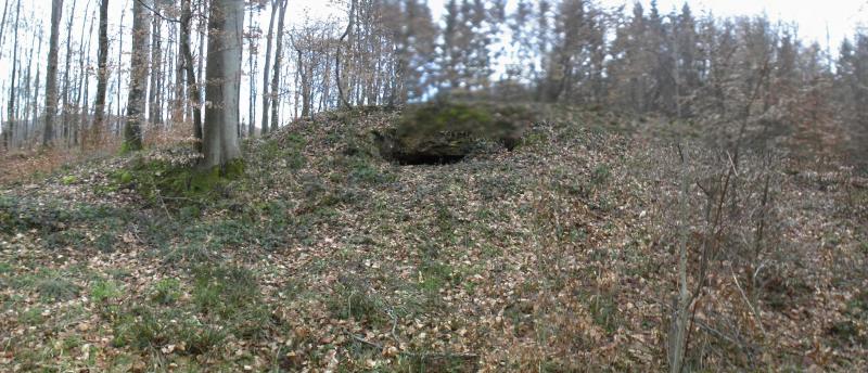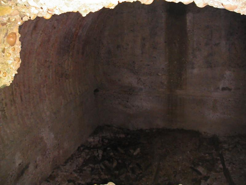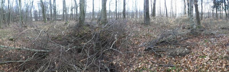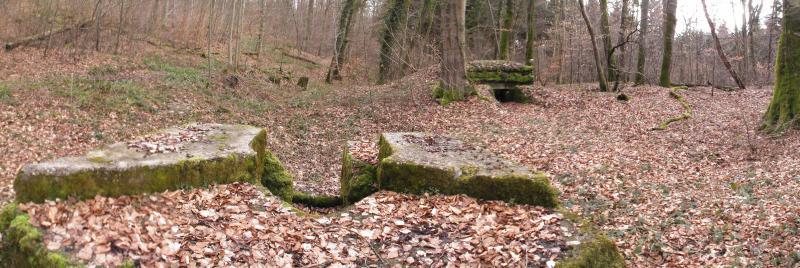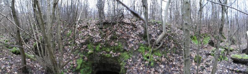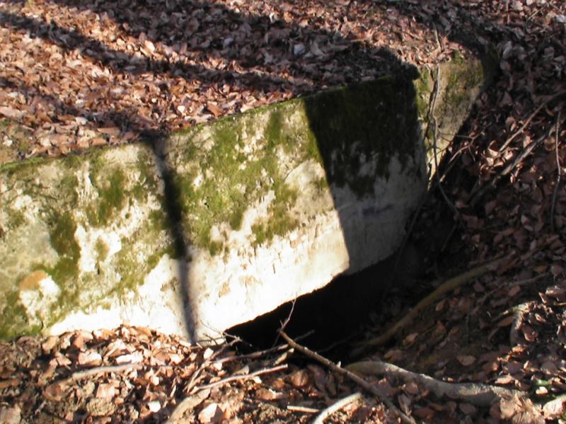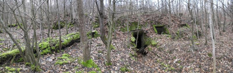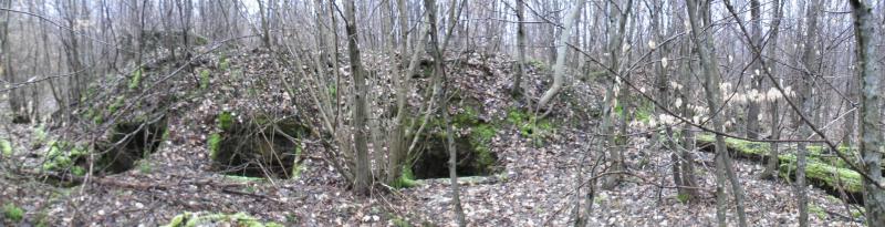 Voici 3 photos en attendant mieux de ce complexe méconnus, il s'agit en fait de 2 salles souterraines en béton avec chacune deux fourneaux de chauffages et de cuissons desservi par 3 entrées, 4 fenêtres et des couloirs souterrains entre complexes. Le tout est extrêmement vaste, au jugé, plus de 100 hommes pouvait y tenir facilement et y coucher en comptant le complexe voisin et distant de moins de 50 mètres relié par sape et tranchés. Je n'avais pas de mètres, alors j'ai compté mes pas. D'un bout à l'autre j'ai fait plus de 55 pas à grandes enjambés pour la longueur et 8 pour la largeur. Je pense au juger que l’abri fait environs 30 x 6 mètres. Il se compose de 2 chambres identique à celle-ci en eau, sauf que la 2eme est sèche et en partie remblayé. Les chambres sont relié par un couloir d'environs 5 mètres de long. Il se compose de 2 entrées, l'une au centre et l'autre à l'EST. Deux cheminée en briques sortent du toit. C'est tout ce que je peu en dire pour le moment faute de plus d'informations.