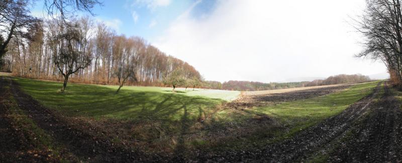 La météo du jour ! Remarquez sur la gauche le beau temps, sur la droite le temps horrible de giboulée que je viens de me prendre sur la gueule, trempé jusqu'au os ! Ici, vous voyez un assemblage de 60 photos, au centre observez bien il y a même un arc en ciel. Sur la gauche vous avez la fameuse forêt à coté de l'étang de ma carte, sur la droite on va plutôt vers les villages de Durlinsdorf et Liebsdorf.