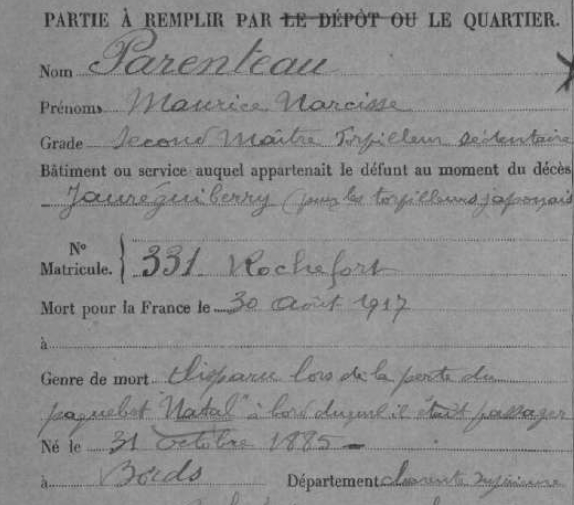 ― PARENTEAU Maurice Narcisse, né le 31 octobre 1885 à Bords (Charente-Inférieure — aujourd’hui Charente-Maritime), domicilié en dernier lieu à Rochefort (– d° –). Second maître torpilleur, cuirassé d’escadre Jauréguiberry, étant destiné à un torpilleur japonais. Inscrit le 10 novembre 1910 au quar-tier de Rochefort, n° 331 ; classe 1905, n° 776 au recrutement de La Rochelle.