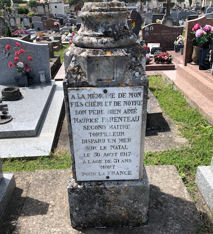 Caveau de famille à Rochefort-sur-Mer (17), du marin Maurice PARENTEAU, second-maître torpilleur sur le JAURÉGUIBERRY, disparu lors de la perte du paquebot NATAL sur lequel il était passager...