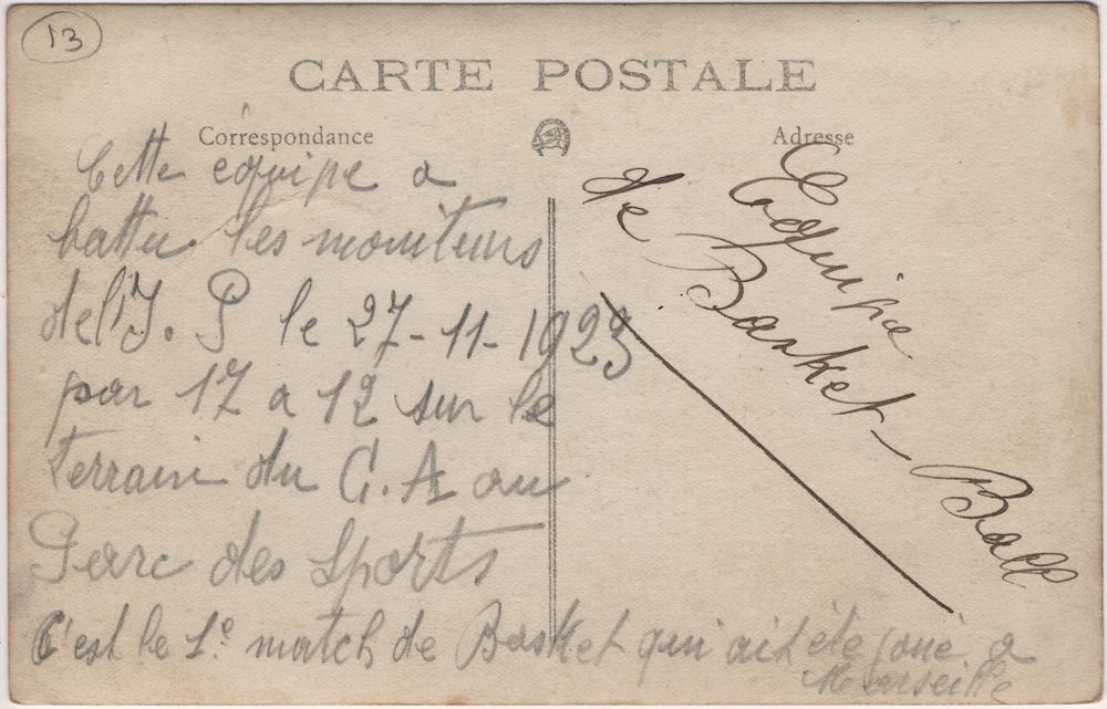 A Marseille, il y a bien eu 'le' premier match de basket-ball, le 25 novembre 1923, mettant aux prises le Police et les Moniteurs de l'I.P.. La victoire est revenue à la Police par 14 à 11.