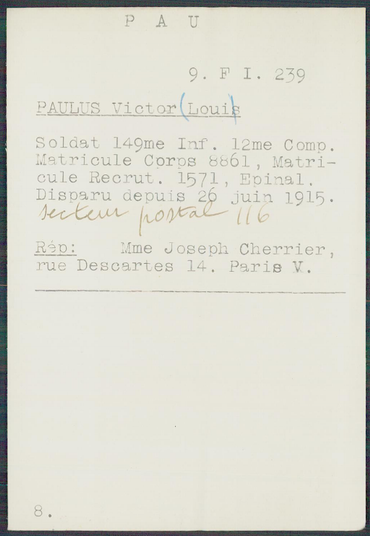 Il y a plusieurs années les élèves de la classe de Karine réalisaient un superbe travail sur les frères Paulus tués en Artois en 1915. Un des deux frères, Louis Victor servait au 149e R.I.. A l'époque, le numéro de sa compagnie n'était pas connu. En fouillant sur le site "prisonniers de la Première guerre mondiale -les archives du C.I.C.R.", pour une autre recherche, j'ai trouvé cette fiche.