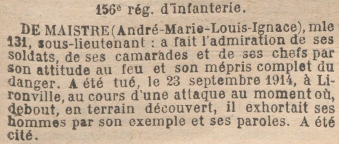 maistre (de) andré 1892 1911 élève école des eaux & forêts 356e RI s/lieutenant 23-sept-14 lironville