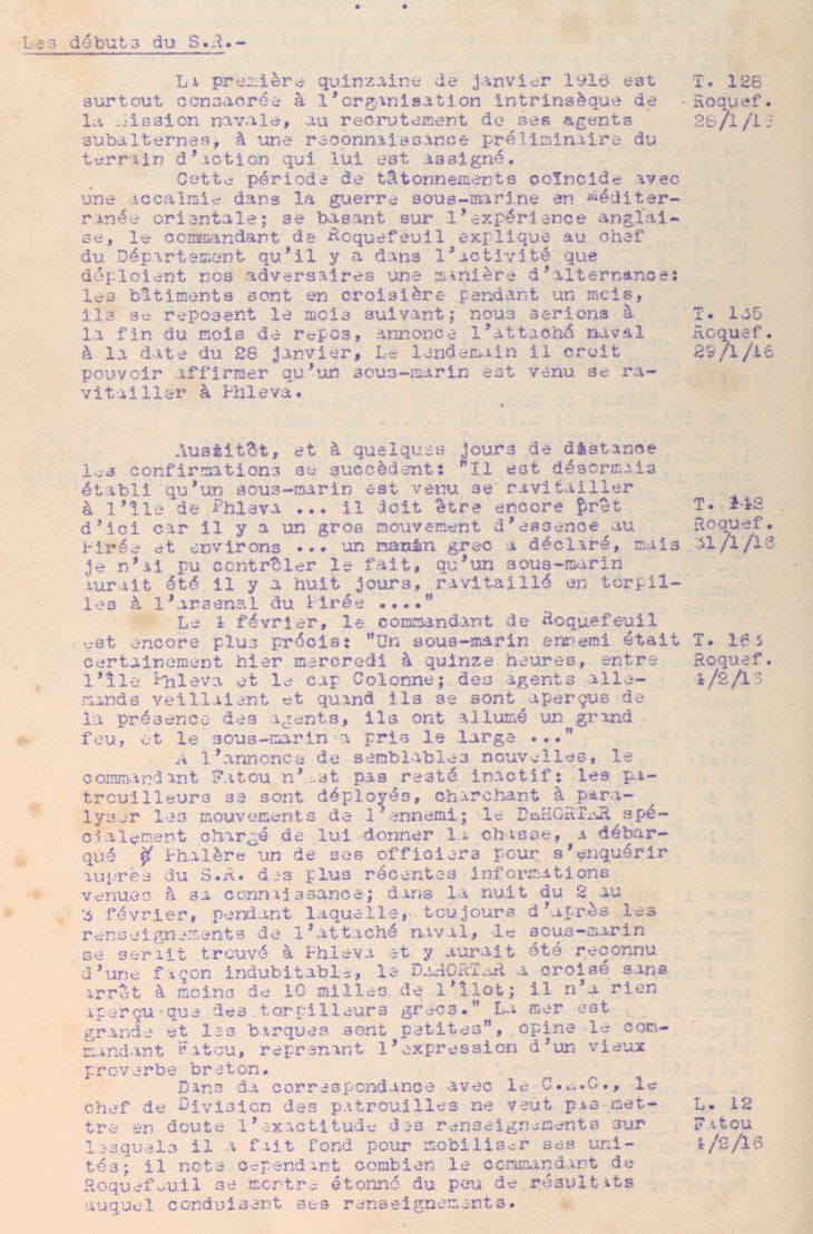 Les raisons du choix et de la nomination du Cdt de Roquefeuil par le Ministre de la Marine (Amiral Lacaze) ne sont pas détaillées dans l'ouvrage. (Il apparait dans des études ultérieures que "Le ministre de la Marine, le contre-amiral Lacaze, désigna en novembre 1915 le capitaine de frégate de Roquefeuil, qui comptait parmi ses proches.")