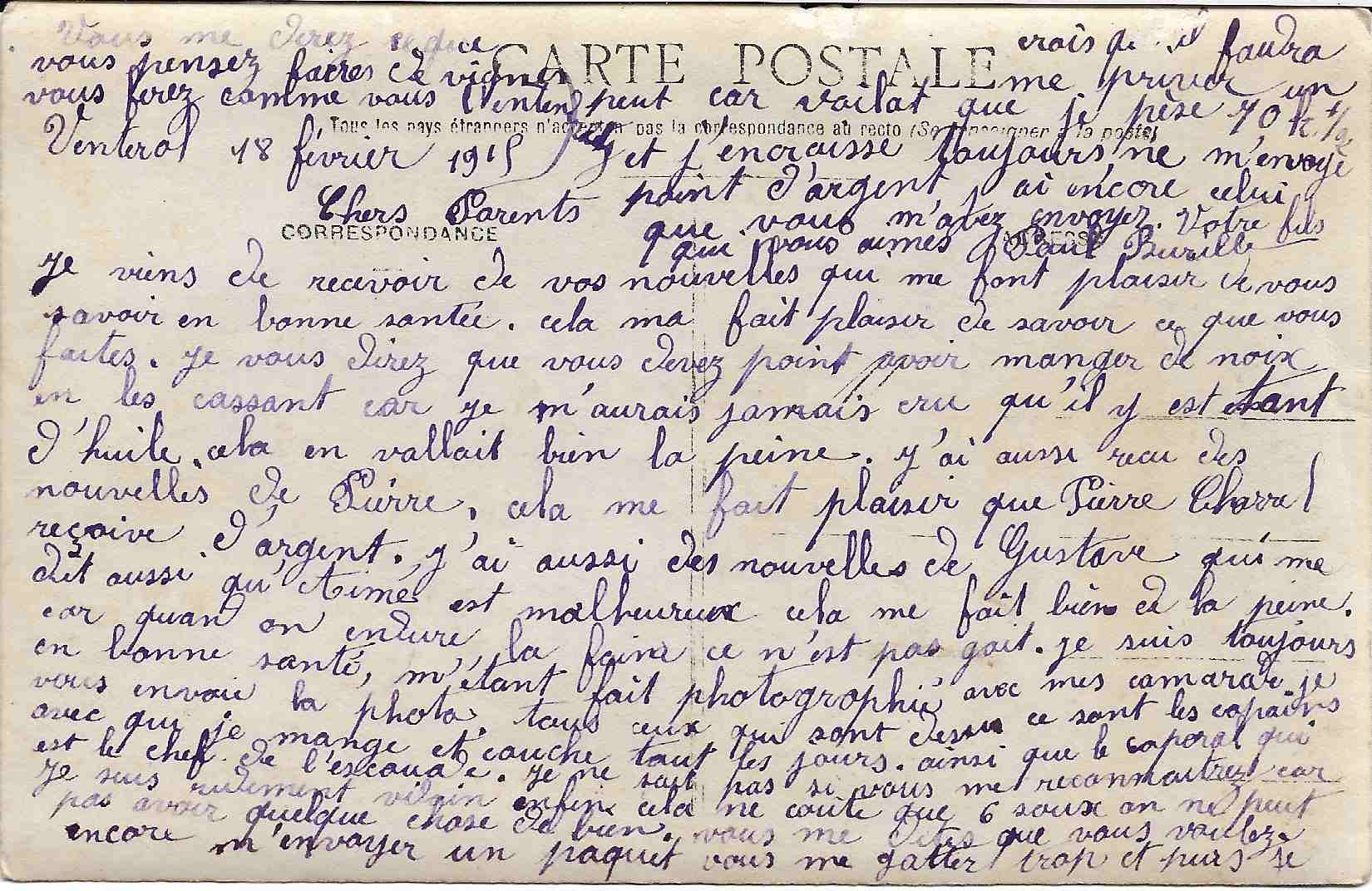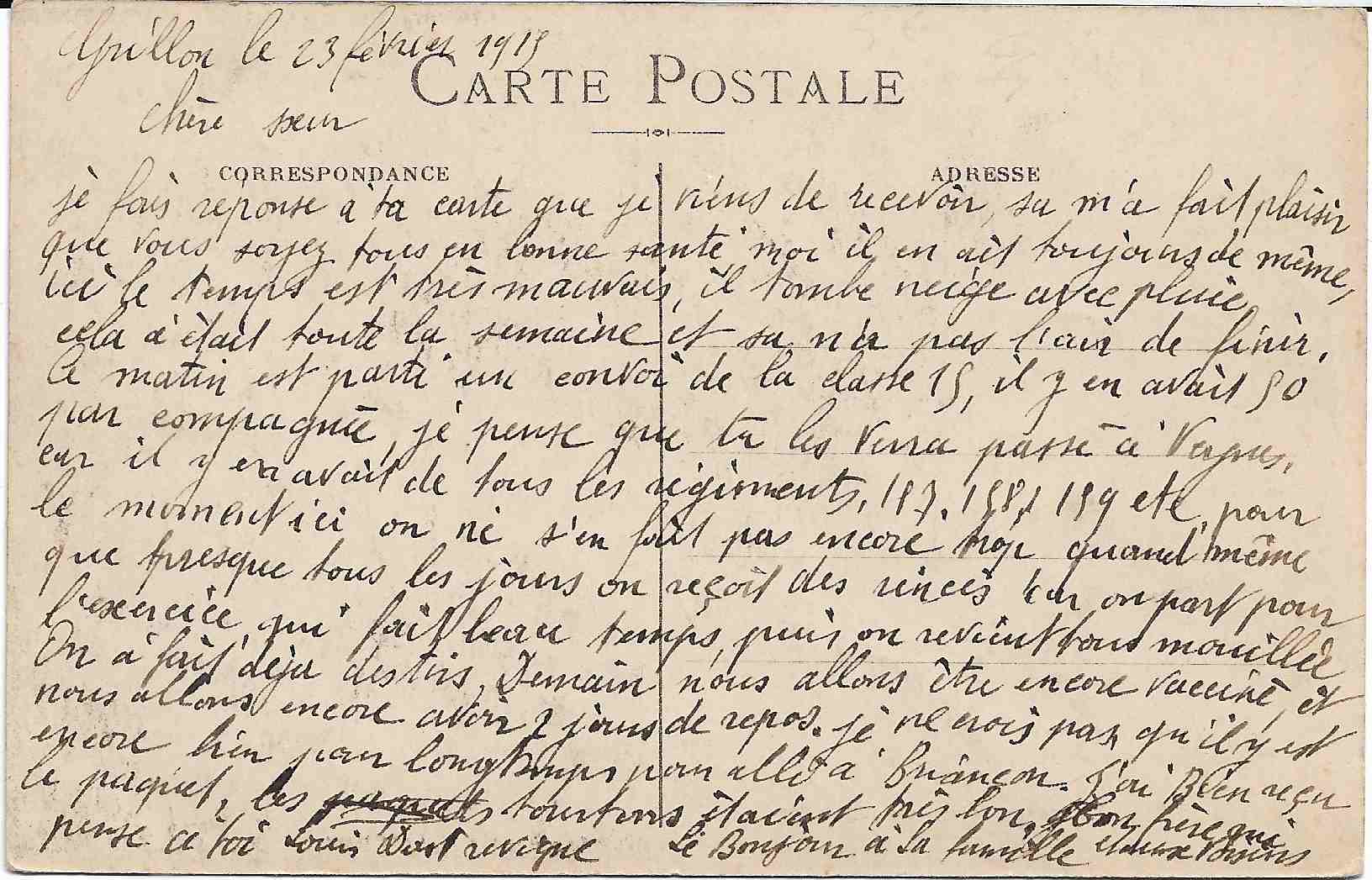 Comme vous le voyez, j’ai encore changé de résidence. Je ne sais pas trop ce que nous venons faire ici. On a concentré ici tous les mitrailleurs de Bataillons de chasseurs. C’est certainement pour former des compagnies pour le front. Il est probable que nous n’y moisirons pas. J’ai eu du regret de quitter Bourg-d’Oisans où je me plaisais beaucoup. Les gens y étaient affables. Mais je crois que nous ne serons pas mal ici. Et puisque on nous trimballe toujours d’un côté ou de l’autre, il faut en prendre son parti. On finit par se faire à cette vie de juif errant. Je suis quand même enchanté de m’être rapproché de la maison et j’espère en profiter pour aller faire un tour jusqu’à Villeneuve. »