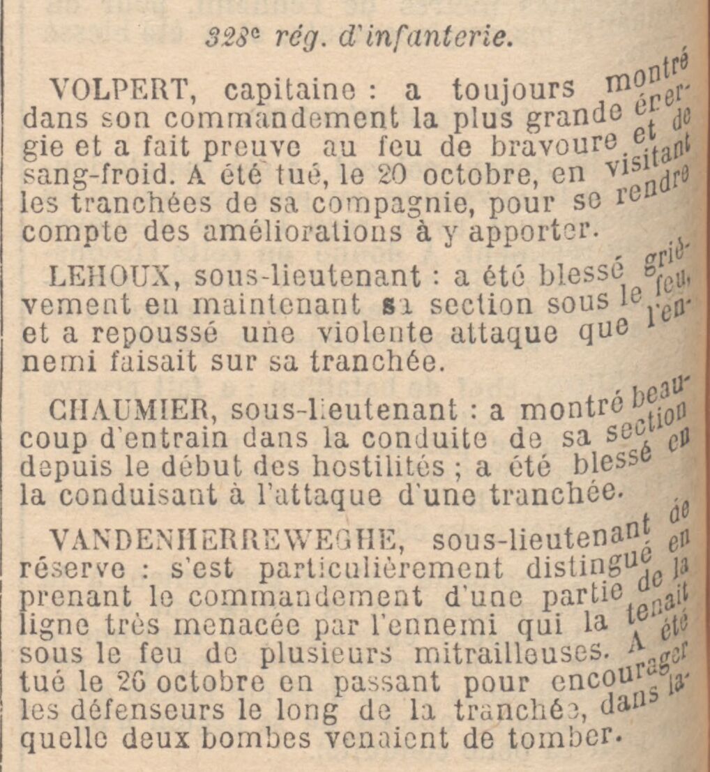 DEVAUX (Théophile-Louis-Alcide), matricule 2846, adjudant à la 14e compagnie du 328e régiment d'infanterie : sous-officier très méritant, consciencieux et dévoué, a, sous un bombardement violent, maintenu courageusement sa section par son énergie et sa belle attitude au feu. Mortellement frappé au cours de l'action. Déjà cité à l'ordre de l'armée.