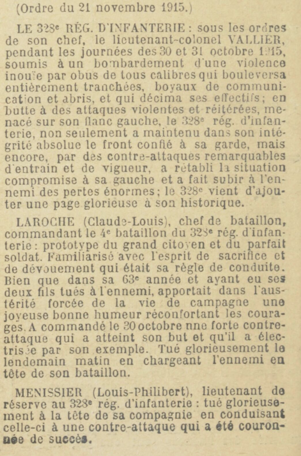 LAROCHE (Claude-Louis), chef de bataillon, commandant le 4e bataillon du 328e régiment d'infanterie : prototype du grand citoyen et du parfait soldat. Familiarisé avec l'esprit de sacrifice et de dévouement qui était sa règle de conduite. Bien que dans sa 63e année et ayant eu ses deux fils tués à l'ennemi, apportait dans l'austérité forcée de la vie de campagne une joyeuse bonne humeur réconfortant les courages. A commandé le 30 octobre une forte contre-attaque qui a atteint son but et qu'il a électrisée par son exemple. Tué glorieusement le lendemain matin en chargeant l'ennemi en tête de son bataillon.