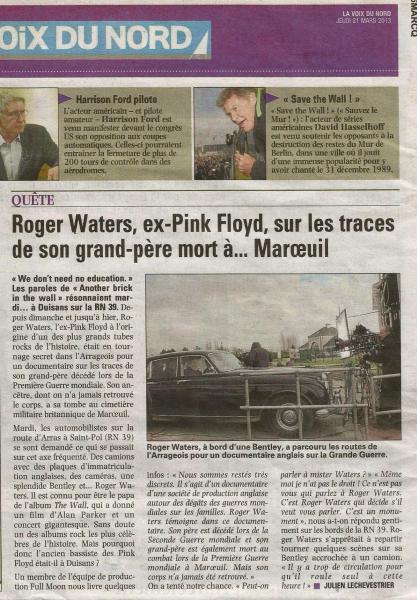 le sujet est bien de 14-18! Le célèbre membre du groupe Pink Floyd était hier dans l'Arrageois (pas de calais) sur les traces de son GP mort à Maroeuil et aux fins d'un documentaire Britannique sur le thème des guerres mondiales! (son père étant mort lors du conflit 39-45)