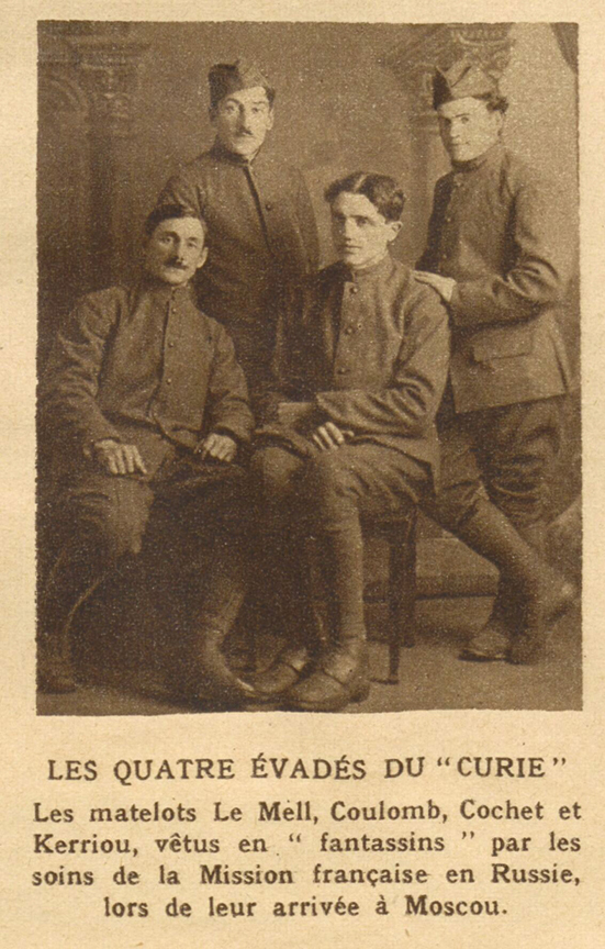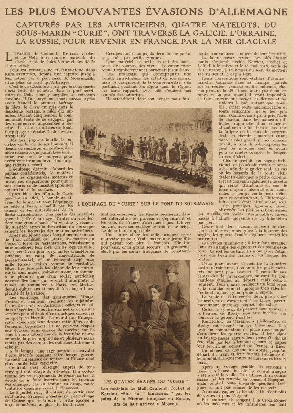 L’évasion de plusieurs quartiers-maîtres du sous-marin Curie faits prisonniers à Pola, en décembre 1914, n’est pas moins intéressante. Les hommes du Curie sont conduits à Grætz puis quelques temps après au camp de Deutschgabel, en Bohême. Le régime alimentaire insuffisant au début de 1915 devient de plus en plus mauvais. Quelques prisonniers aux équipages du Monge et du Fresnel, ainsi que deux russes, dont le petit-fils de Tolstoï, essayent de s’évader, mais ils sont repris au bout de quinze jours. En juillet 1917, dix marins français du Curie, du Fresnel, du Foucault et du Monge sont envoyés à Siedhiezka, en Galicie, pour des travaux des champs. Les habitants simples et naïfs se laissent dominer par leurs prisonniers ; ceux-ci font ce qu’ils veulent, changent de patron quand ce dernier leur déplaît. Un soldat autrichien surveille le village, mais est obligé de travailler lui-même pour manger.