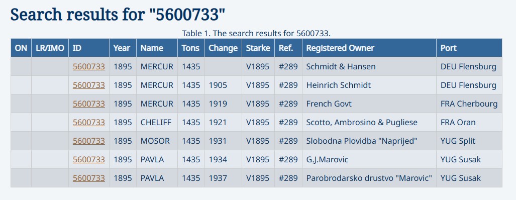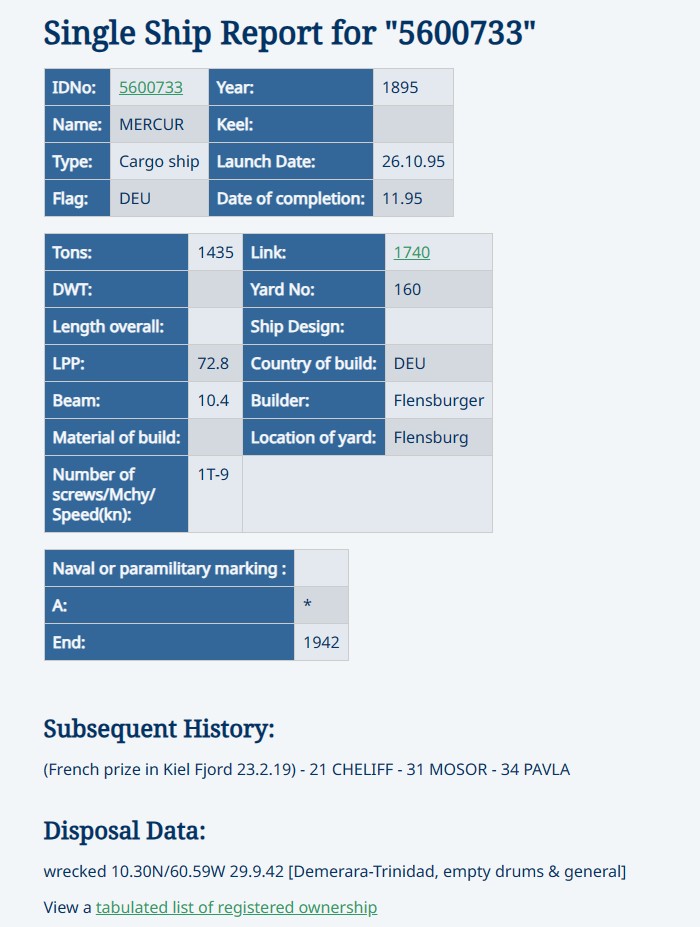 Built as German "Mercur". 23.02.19 (!) seized by French ships off Kiel. 1919 French "Mercur". 1921 French "Cheliff". 1930 Yugoslavian "Mosor". 1934 Yugoslavian "Pavla". 29.09.42 wrecked off Trinidad.