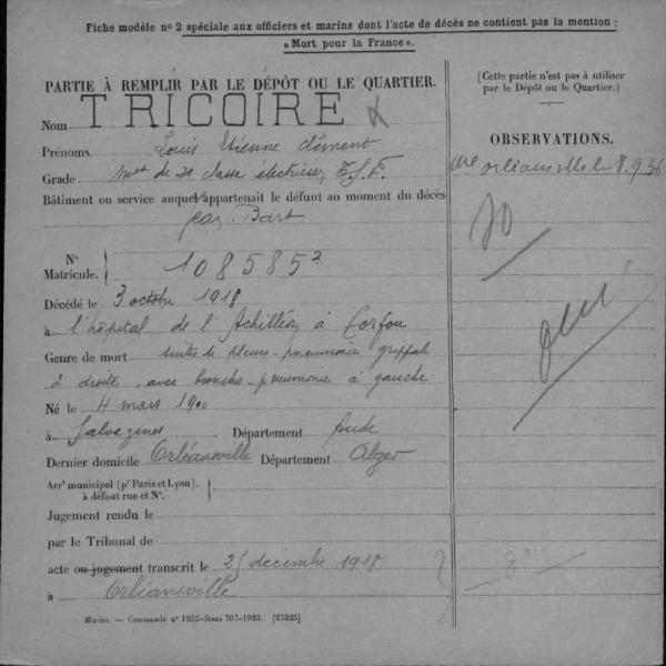 Faisant une étude sur les soldats de 14-18 morts pour la France portant mon patronyme dans le sud de la France, j'ai trouvé cette fiche (jointe en annexe). Ma question est: qui aurait des infos sur ce marin: sépulture, transcription ou autre car mort à l'étranger.