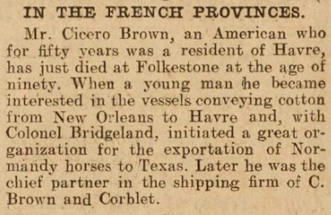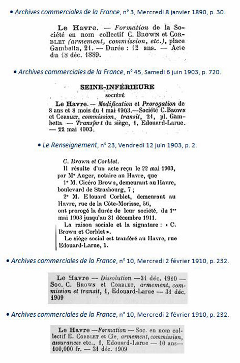Société formée par acte du 18 décembre 1889 par MM. Cicero BROWN, vice-consul des États-Unis au Havre, et Édouard CORBLET. Durée initiale : 12 ans. Capital social initial : ... Siège social initial : Le Havre, 21, place Gambetta. Objet social : « Armement, commission, assurances, ... ». (Archives commer-ciales de la France, n° 3, Mercredi 8 janvier 1890, p. 30)