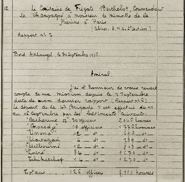 -Il y a des courriers concernants les dates de départ des bateaux qui vont transporter ces soldats russes depuis la Russie d' Arkhangelsk jusqu'à Brest ou Nantes pour la 3 eme brigade qui reste en France ( La 1ere étant déjà arrivée en avril 1916 par Marseille) Arkhangelsk => Brest ou Nantes puis Marseille pour celle qui vont à Salonique.