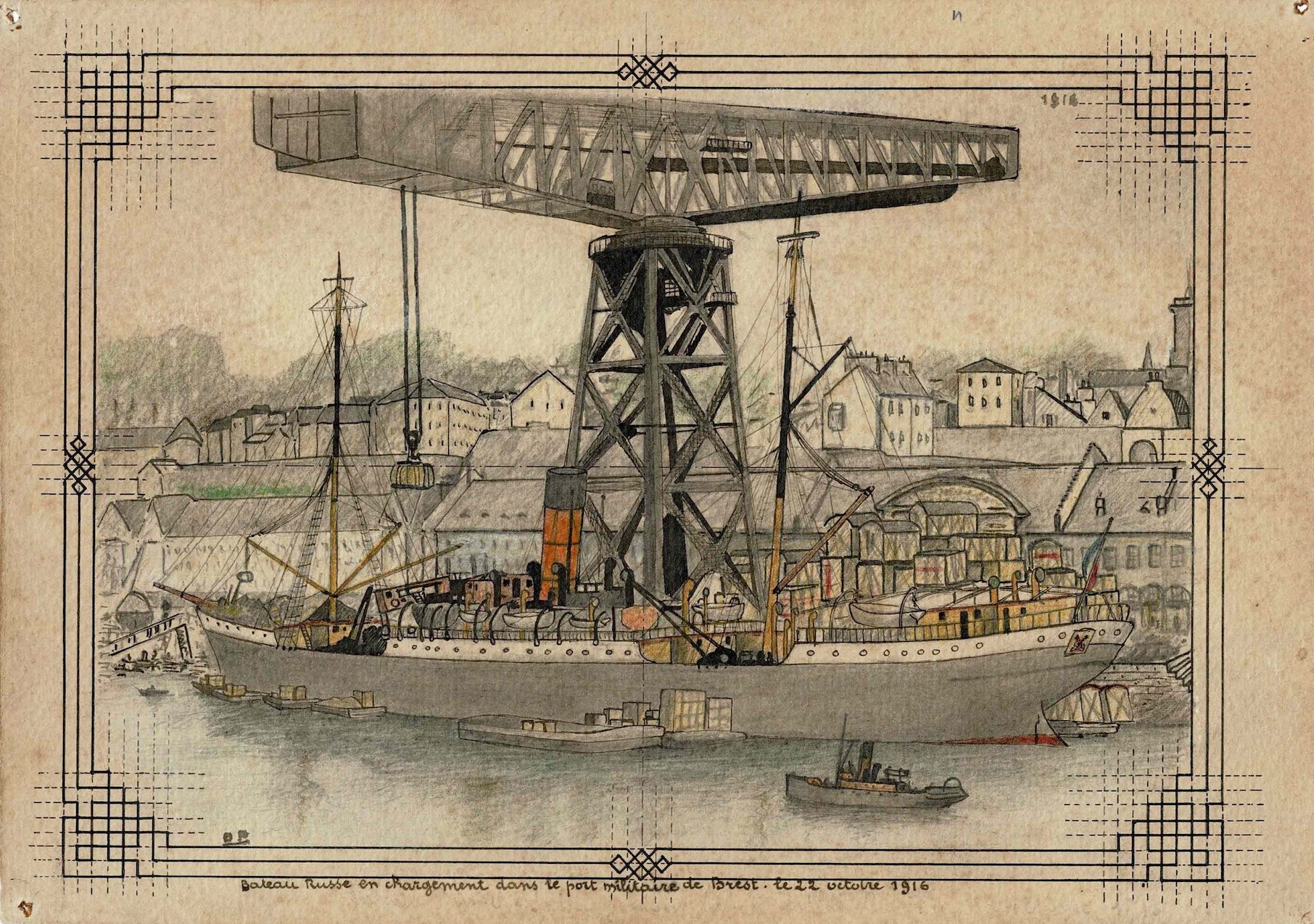 Un élève breton de 16 ans, Paul DUBOIS, a dessiné le 22 octobre 1916 un de ces navires affrété au transport des troupes russe et mouillant à Brest. Il semble que ce soit le vapeur MINGRELIE de la compagnie PAQUET voire le vapeur PHRYGIE de la même compagnie mais je trouve curieux qu'il ait une cheminée au couleurs des vapeurs de la Transat et une coque aux couleurs des cargos SGTM.