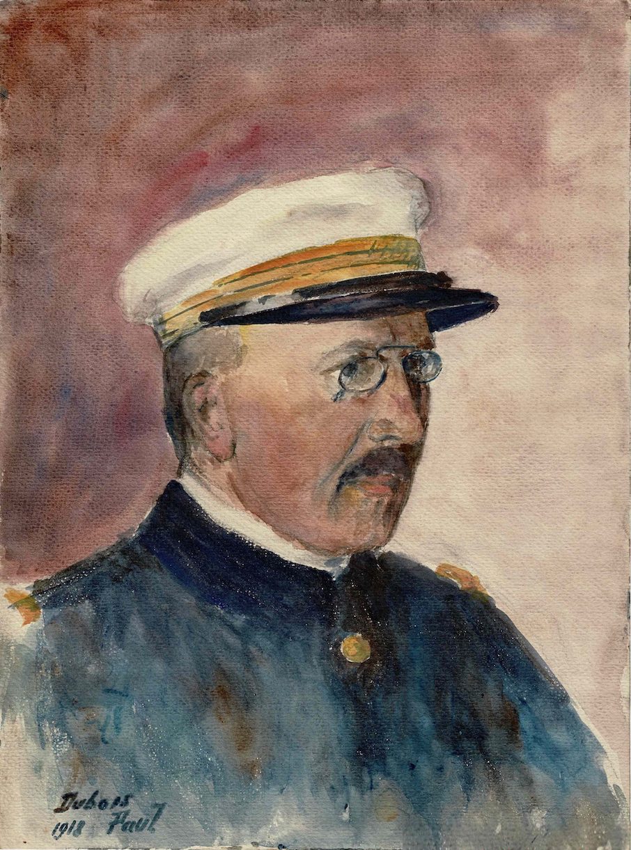 On trouve aussi sur cette page le portrait d'un officier en aquarelle (voir ci-dessous) peint en 1918 qui pourra peut-être aider à identifier ce navire s'il faisait partie de l'état-major de son équipage mais c'est peu probable car les dessins ont deux ans d'écart.