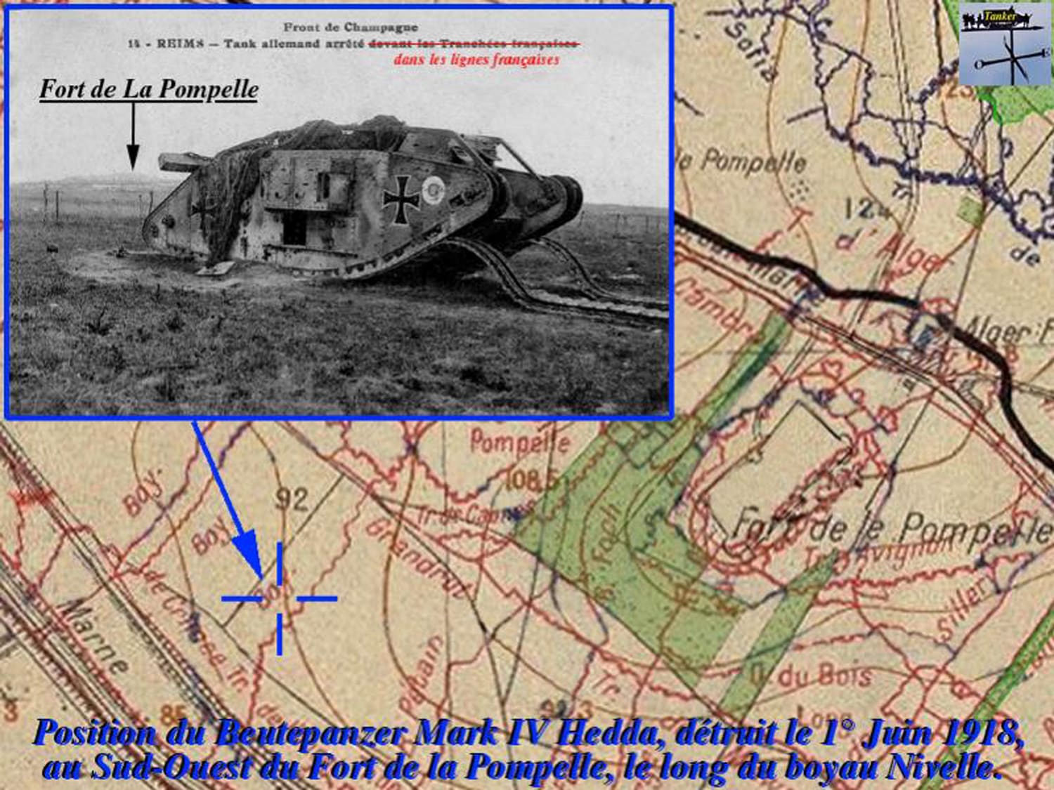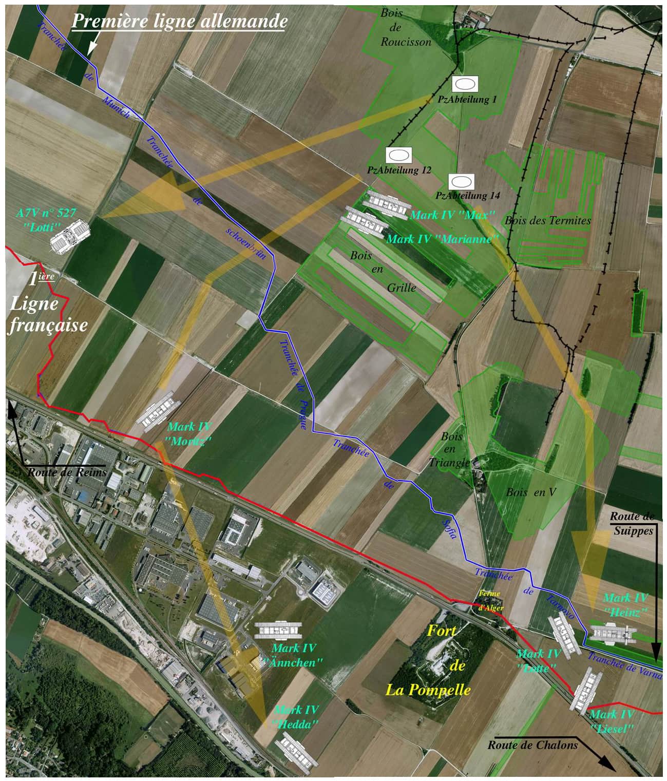Les Mark IV Lotte et Liesel se trouvaient non loin du célèbre Fort de La Pompelle et sur le bord d'axes routiers importants (route de Chalons et route de Suippes).