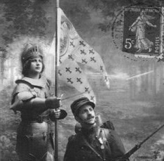 Mais je sais qu'il en existe au moins une autre, peinte par Maurice André Cagnet, poilu venant de Carency, sapeur du Génie et néanmoins peintre et illustrateur. Hospitalisé à l'HT 29 de la 18e RM, il a offert au médecin-chef une oeuvre faite pendant sa convalescence. Voici ce qu'en dit le journal local du 12 septembre 1915 : "Jeanne et ses Rosalies" représentant "Jeanne d'Arc auréolée brandissant son épée de la main droite contre l'ennemi et de la gauche son oriflamme bleu et blanc. Elle couvre et protège de ses ailes des braves qu'elle regarde fière, calme et confiante, charger baïonnette au canon et drapeau tricolore en tête". Je n'ai pas réussi à retrouver cette oeuvre qui a aussi été éditée en carte postale.