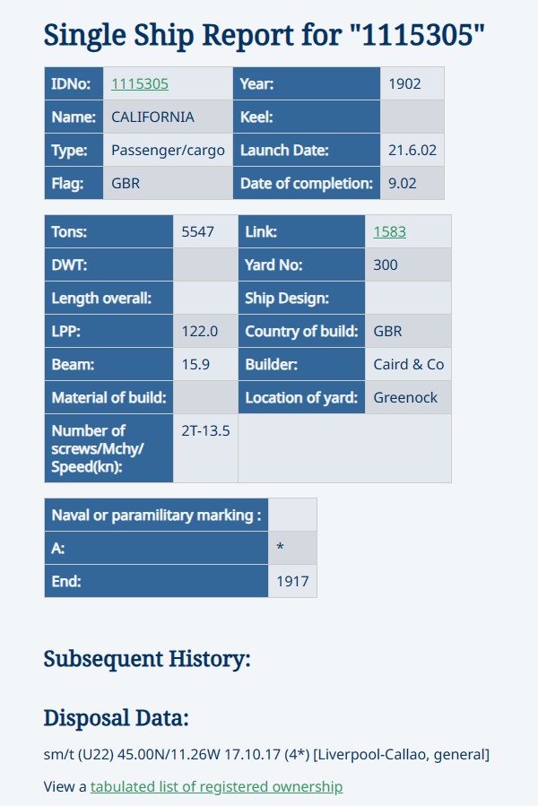 Voici la fiche Miramar du CALIFORNIA coulé en 1917 par le sous-marin allemand U22 :