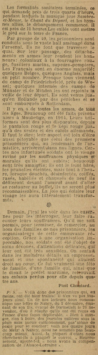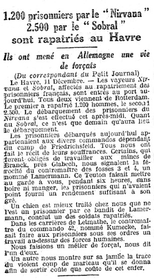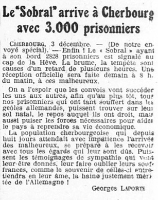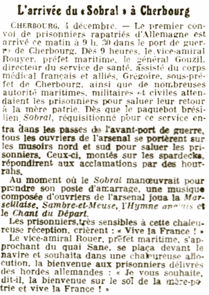En Décembre 1918, le Sobral assura le rapatriement au Havre de prisonniers de guerre qui venaient d’être libérés des camps allemands, puis, en Janvier 1919, celui de civils qui s’étaient réfugiés aux Pays-Bas. La même année, il fut ensuite utilisé pour le transport des troupes démobilisées, spéciale-ment à destination de l’Afrique du Nord.