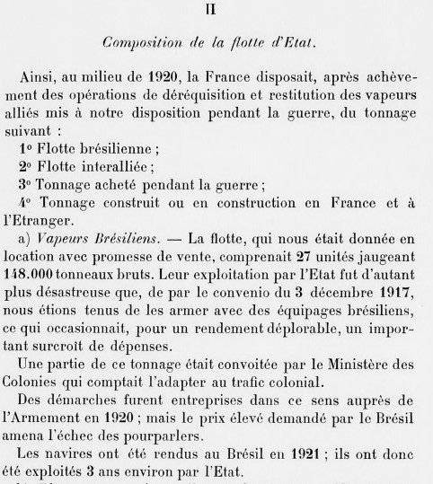 Le 17 mars 1921, le Sous-secrétaire d’État à la Marine marchande informa le Ministre des affaires étran-gères que le terme de la convention d’affrètement était définitivement arrêté au 31 mars 1921. En Avril 1922, le Sobral, avec le paquebot Léopoldina, ex-Blücher allemand, fut cédé par l’État brésilien à l’État français (L’Ouest-Éclair ― éd. de Caen ―, n° 7.469, Dimanche 16 avril 1922, p. 7, en rubrique « Nouvelles maritimes ») pour le prix global de 11.000.000 fr. ; ces deux navires se trouvaient respec-tivement désarmés dans les ports du Havre et de Brest. Dès Mai 1922, en exécution de l’article 2 de la loi du 9 août 1921 ayant prescrit la liquidation de la flotte de l’État avant le 31 juillet 1923 (J.O. 10 août 1921, p. 9.390), il fut cédé par l’État aux Services contractuels des Messageries maritimes pour le prix de 4.500.000 fr., somme payée comptant [L’Ouest-Éclair ― éd. de Caen ―, n° 7.513, Mardi 30 mai 1922, p. 6, en rubrique « Nouvelles maritimes » ― Loi du 21 janvier 1928 portant approbation des con-trats de vente de navires de la flotte de l’État, Annexe III. : J.O. 28 janv. 1928, p. 1.011].