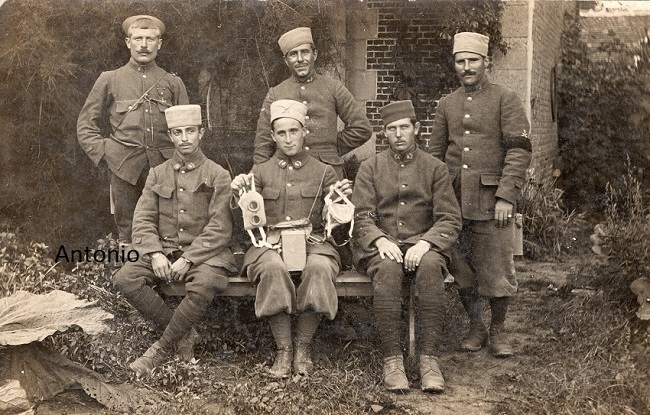 Antonio : Il ne semble pas y avoir de plis sur les chéchias. Ne pourrait-il pas s'agir de la chéchia bleu horizon qui eut une existence fugace pour les troupes d'Afrique, apparue peu après le début de la guerre ?