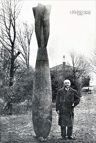 On voit ici le professeur Florentin, du Laboratoire Municipal, au côté de la bombe de allemande de 1.000 kg: