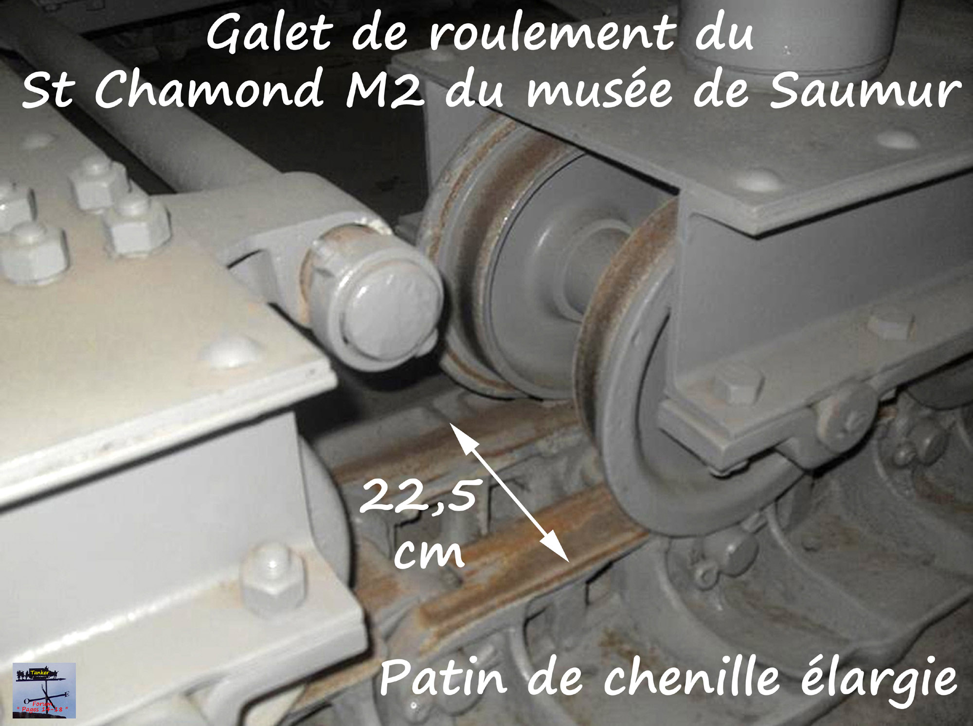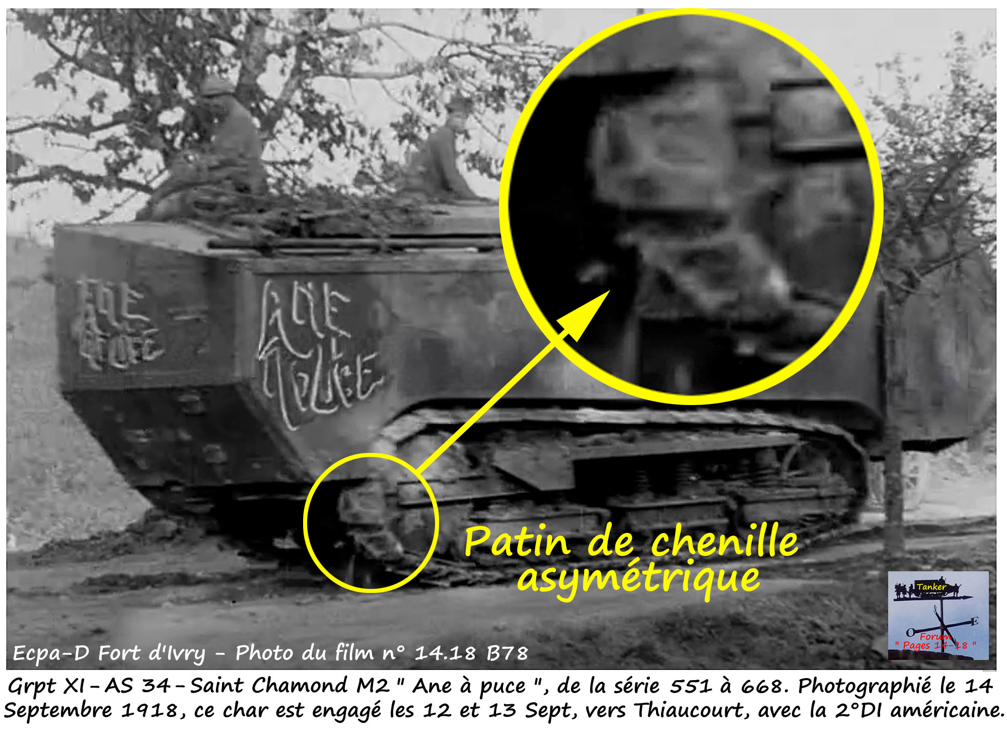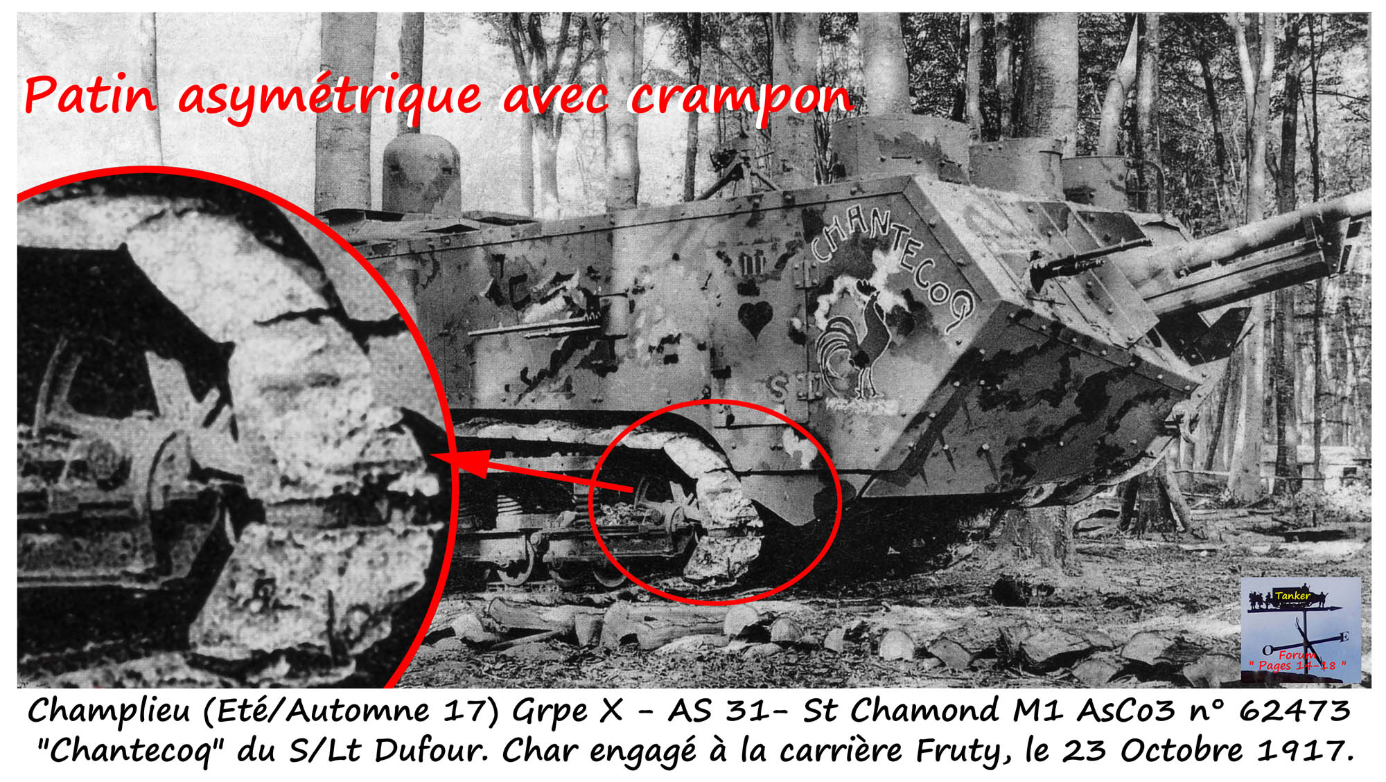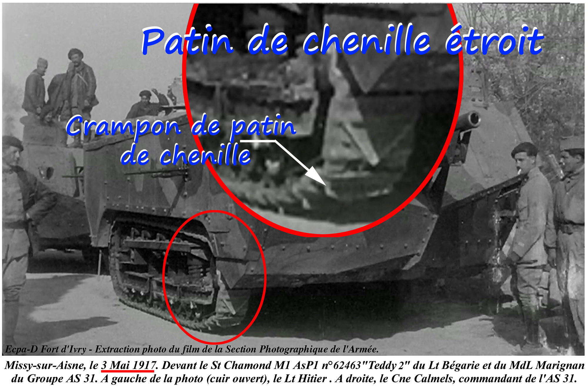 Les photos montrent bien que les premiers Saint Chamond, engagés sur le Chemin des Dames en Mai 1917, sont équipés de chenilles étroites et que dès le deuxième engagement de l'AS, en Octobre 1917, les chars disposeront de chenilles asymétriques.