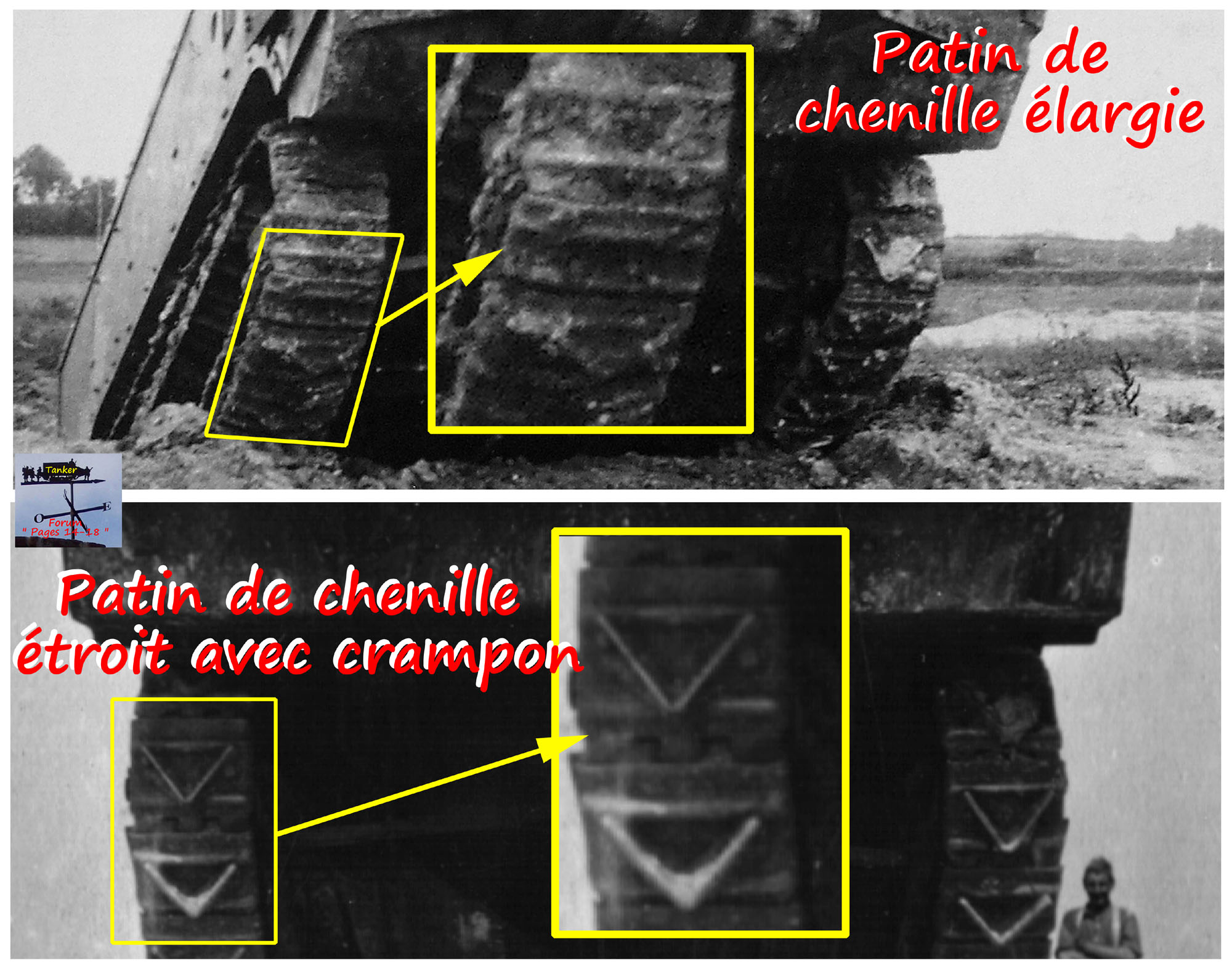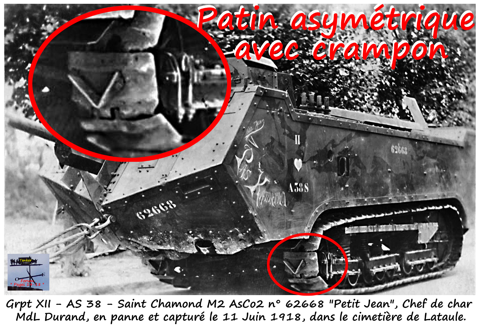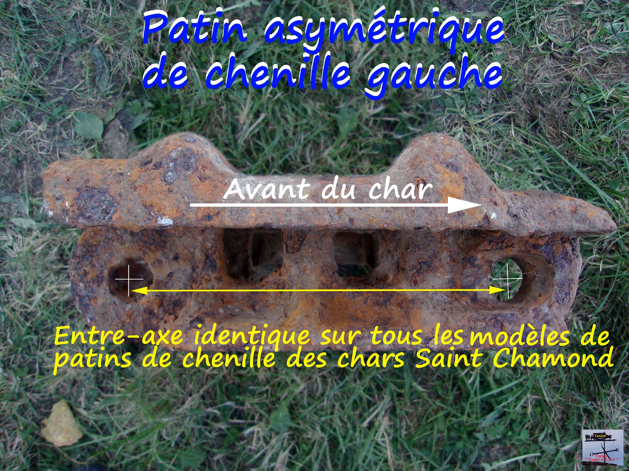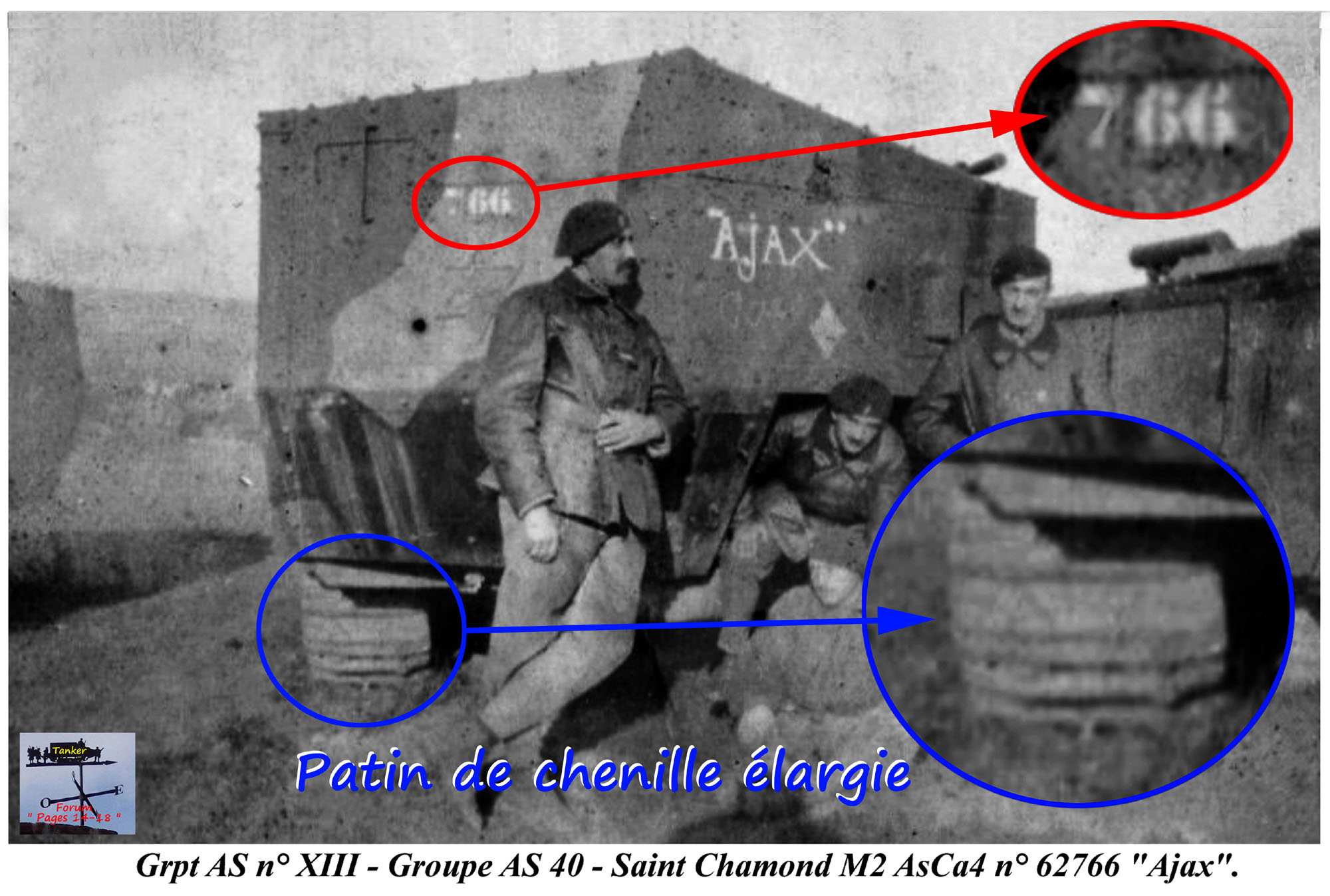 Les photos montrent bien que les premiers Saint Chamond, engagés sur le Chemin des Dames en Mai 1917, sont équipés de chenilles étroites et que dès le deuxième engagement de l'AS, en Octobre 1917, les chars disposeront de chenilles asymétriques.