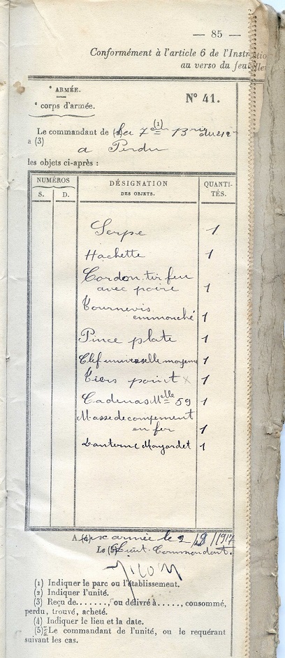 Le livret de pièce indique les matériels disparus lors de cet épisode. Comme toujours, il est probable que le capitaine en profite pour remplacer des équipements usés, pas forcément tous détériorés par le tir de l'ennemi. Il faut savoir profiter de toutes les occasions à condition de ne pas abuser car toutes ces pertes passent ensuite au contrôle du général, commandant de l'Artillerie du Corps d'Armée afin de déterminer si ces pertes sont à prendre en compte sur les deniers de l'état (le capitaine est lui responsable sur ses deniers du matériel confié par l'état!):