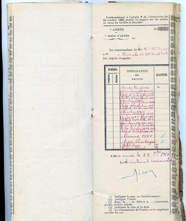 Les Registres à souche ont conservé la trace des matériels perdus pendant ces 9 journées difficiles: