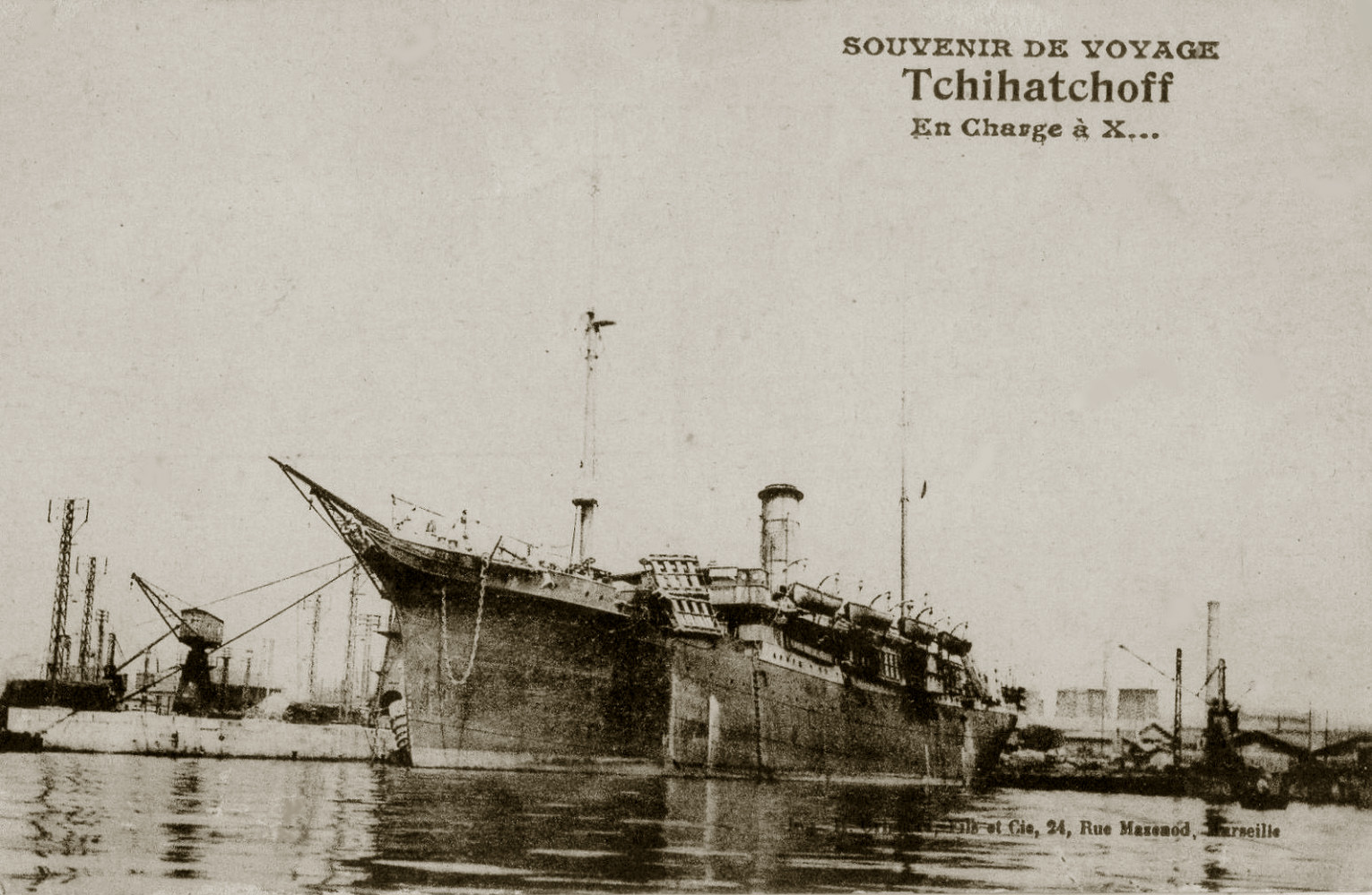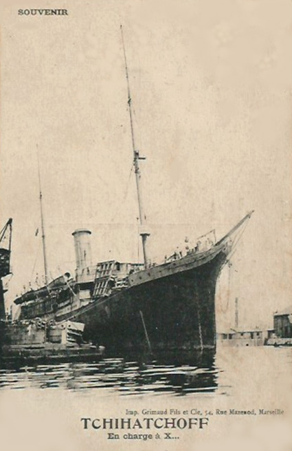 Tchihatchoff [II] — Paquebot mixte — Compagnie russe de navigation à vapeur et de commerce, dite « Ropit » [Русское общество пароходства и торговли (РОПиТ)], société constituée en 1856, dont la direction générale était à Saint-Pétersbourg, au 43, perspective Nevski, et le bureau central à Odessa, rue Langeron (1892~1925).
