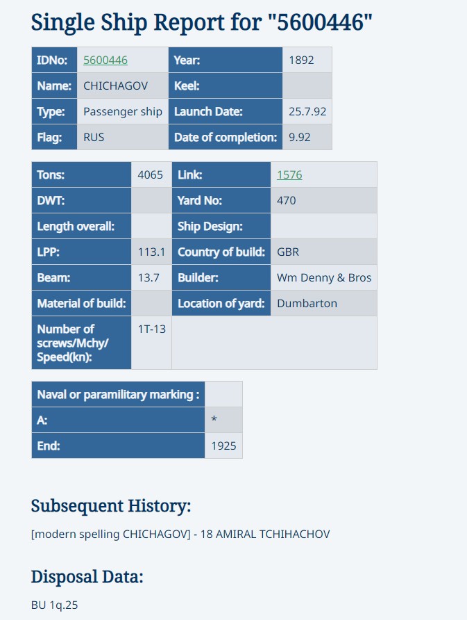 Pour le site Miramar, le navire aurait été renommé AMIRAL TCHIHACHOV sous pavillon français :