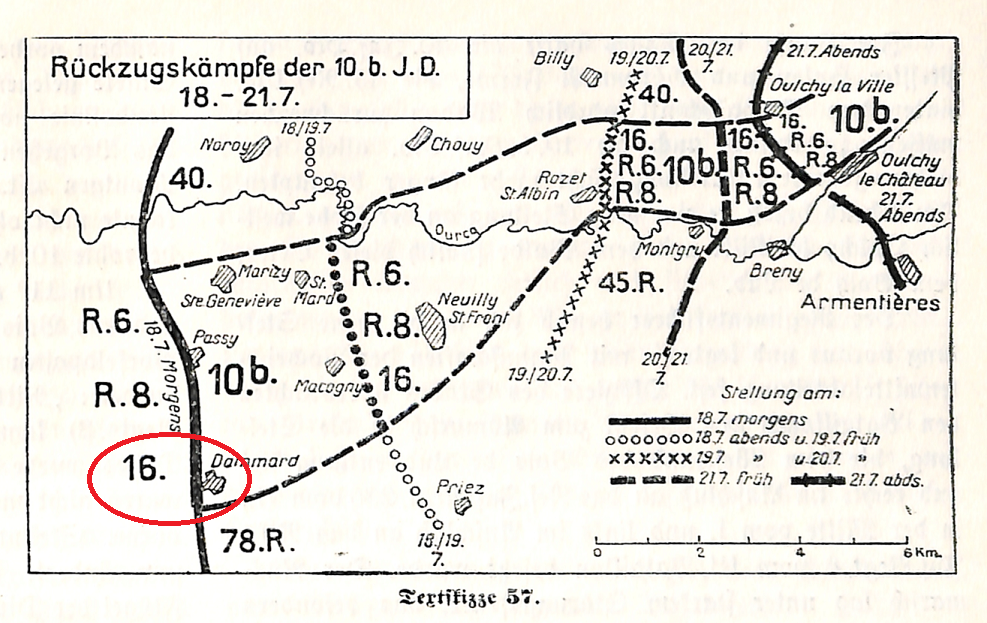 On apprit par les blessés de retour que l'ennemi avait contre-attaqué dans la ligne Faverolles - Troësnes - Mosloy Ferme avec l'appui de chars. Ce ne sont pas ceux-ci, combattus en grand nombre, qui se font sentir d'une manière désagréable, mais les aviateurs, qui ont attaqué les lignes, encore non protégées à découvert, avec des bombes et des mitrailleuses. (…)