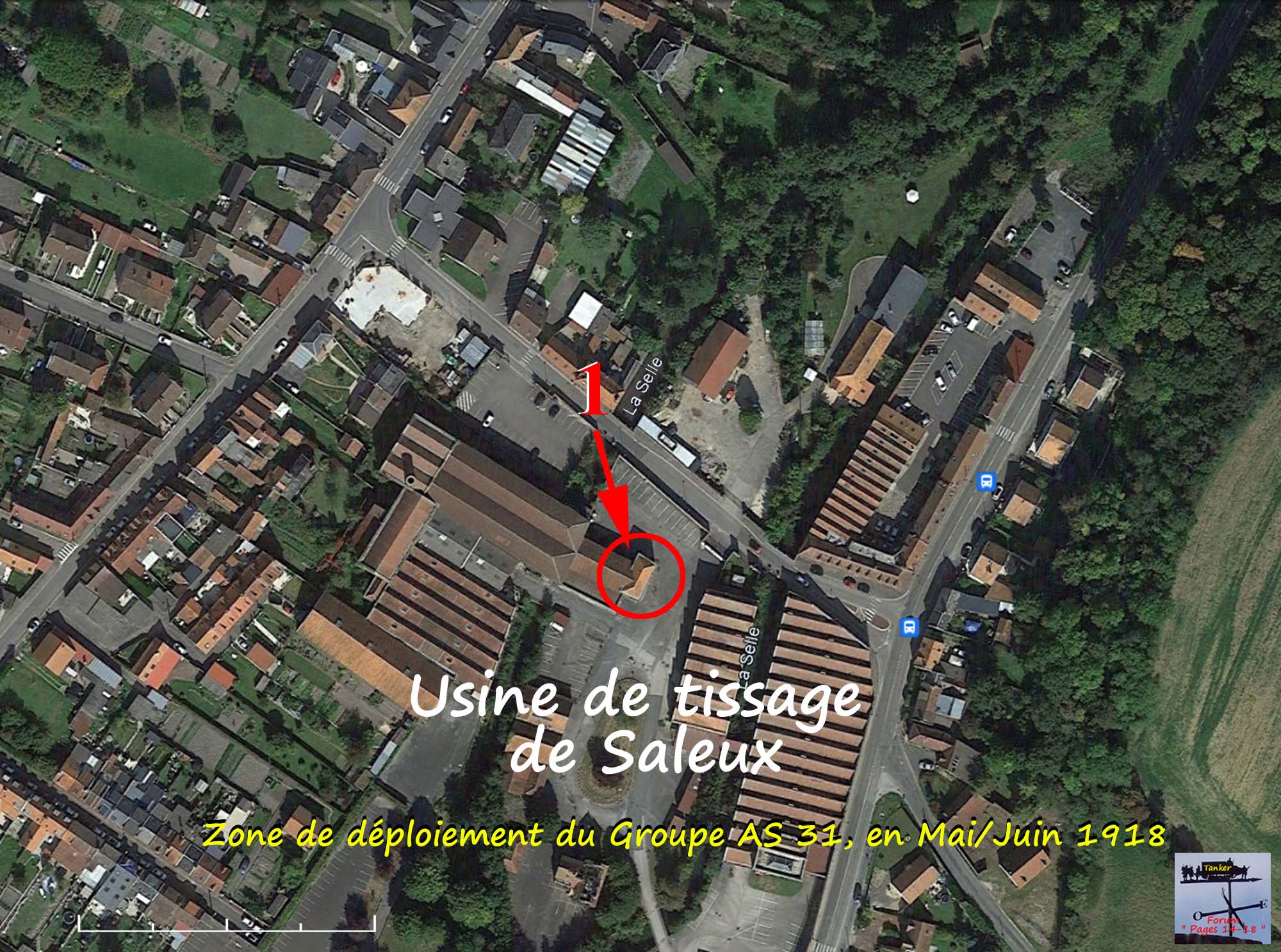 Le débarquement du Groupement AS n° X, en gare de Saleux (au Sud/Ouest d'Amiens)' a lieu les 9 et 10 Mai 1918. Le Groupe AS 31, et sa section d'Echelon, est installée à Saleux dans l'usine de tissage.
