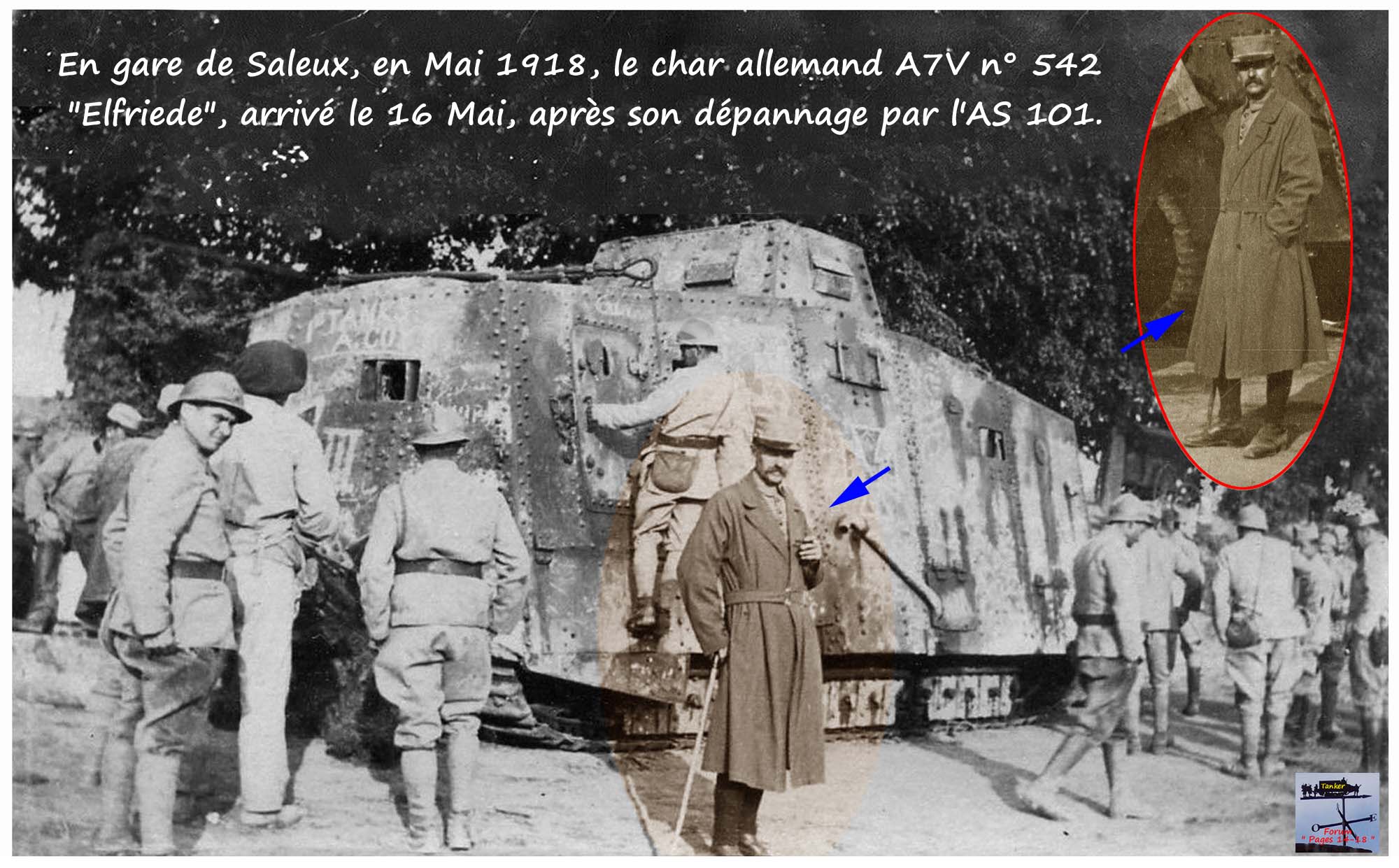 Devant le char A7V, récupéré par la SRR 101, au Sud de Villers-Bretonneux, le même personnage que devant le Saint Chamond de l'Echelon de l'AS 31. Peut-être le chef d'Echelon, passé Sous-Lieutenant depuis peu . . . .