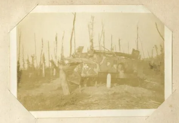 Char détruit, le long des bois de la Miette, après le passage de la Tranchée du Ruisseau.