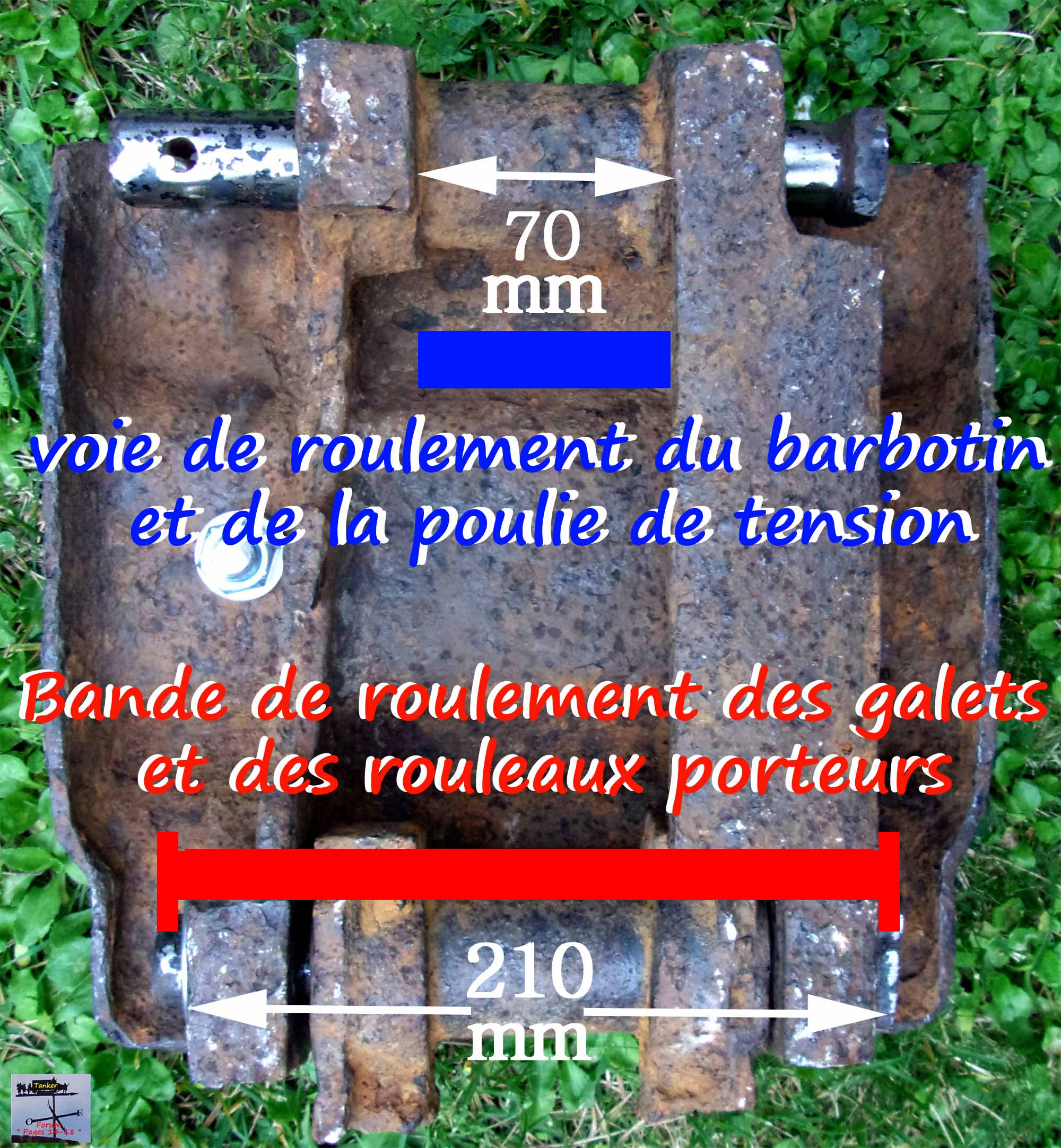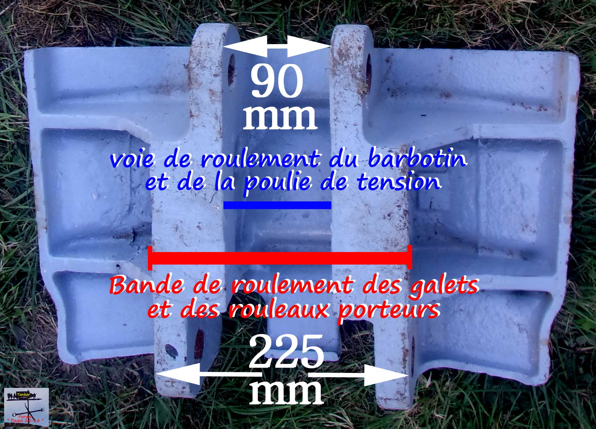 L'axe de roulement est à la largeur du barbotin et de la poulie de tension et celui de la voie de roulement à celle des galets et rouleaux.