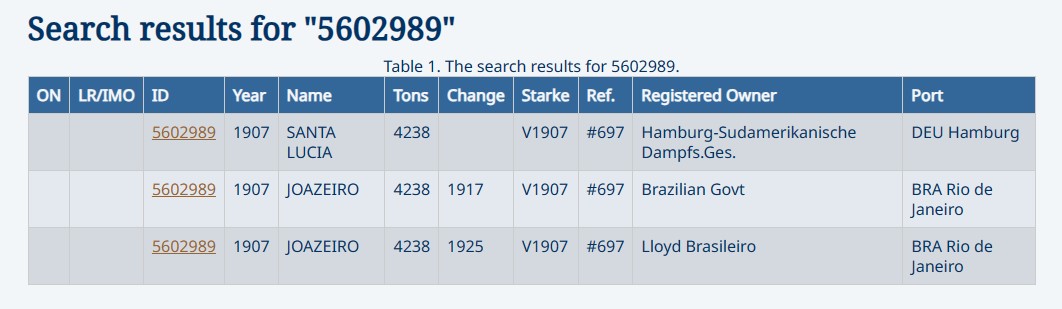 La fiche Miramar du vapeur brésilien JOAZEIRO (ex SANTA LUCIA - Allemagne) en location avec promesse de vente exploité par la Flotte d'Etat à compter de 1917 :