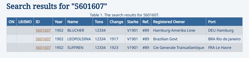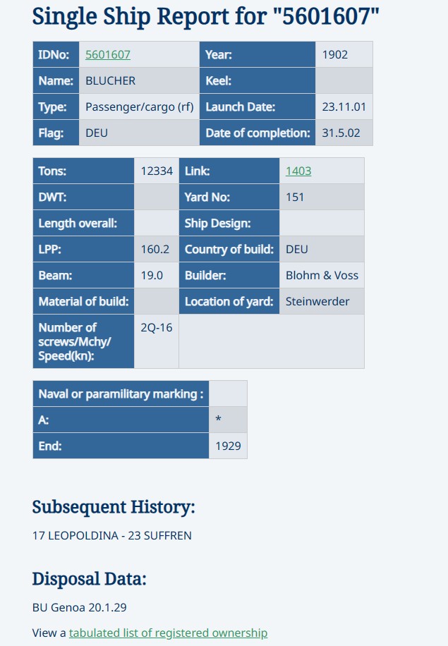 Paquebot en acier lancé le 23 novembre 1901 sous le nom de Blücher par le chantier de Steinwerder (Allemagne) de la société Blohm und Voss GmbH pour le compte de la Hamburg-Amerikanische Packet-fahrt-Actien-Gesellschaft (H.A.P.A.G.) dont le siège était à Hambourg (‒ d° ‒) ; achevé en Février 1902. Attaché au port de Hambourg ; signal distinctif : R.M.N.Q. (1) Affecté à la ligne d’Amérique du Sud [Hamburg-Amerika Linie (H.-A.L.)].