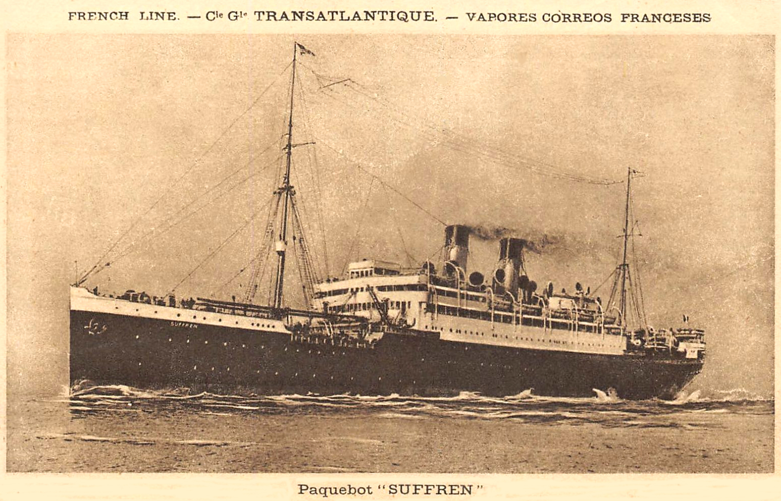 Le 17 mars 1921, le Sous-secrétaire d’État à la Marine marchande avait informé le Ministre des affaires étrangères que le terme de la convention d’affrètement serait définitivement arrêté au 31 mars 1921. En Avril 1922, le Léopoldina, avec le Sobral, ex-Cap-Vilano allemand, fut cédé par l’État brésilien à l’État français (L’Ouest-Éclair – éd. de Caen –, n° 7.469, Dimanche 16 avril 1922, p. 7, en rubrique « Nouvelles maritimes ») pour le prix global de 11.000.000 fr. ; ces deux navires se trouvaient respec-tivement désarmés dans les ports de Brest et du Havre. En exécution de l’article 2 de la loi du 9 août 1921 ayant prescrit la liquidation de la flotte de l’État avant le 31 juillet 1923 (J.O. 10 août 1921, p. 9.390), il fut ensuite cédé par l’État à la Compagnie générale transatlantique pour le prix de 6.500.000 fr., avec 5 ans de crédit [Loi du 21 janvier 1928 portant approbation des contrats de vente de navires de la flotte de l’État, Annexe III. : J.O. 28 janv. 1928, p. 1.011 et 1.013]. Francisé le 5 mai 1923 au quartier du Havre, n° 5.802, il y fut immatriculé le 8, f° 698, n° 2.111, sous le nom de Suffren, ayant pour signal distinctif les lettres : O.V.Q.H. (8)